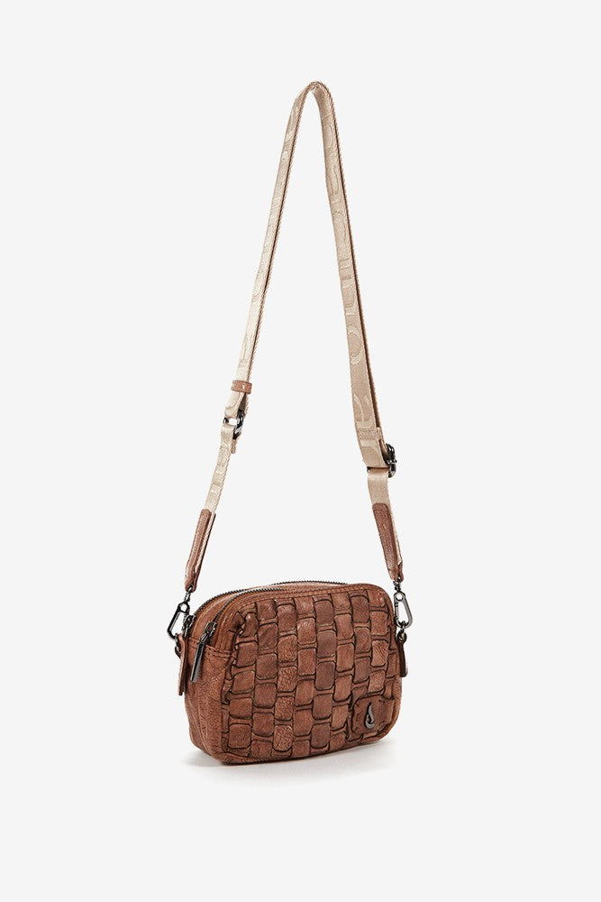 Umhängetasche mit Quaste aus recyceltem Material in Cognac.