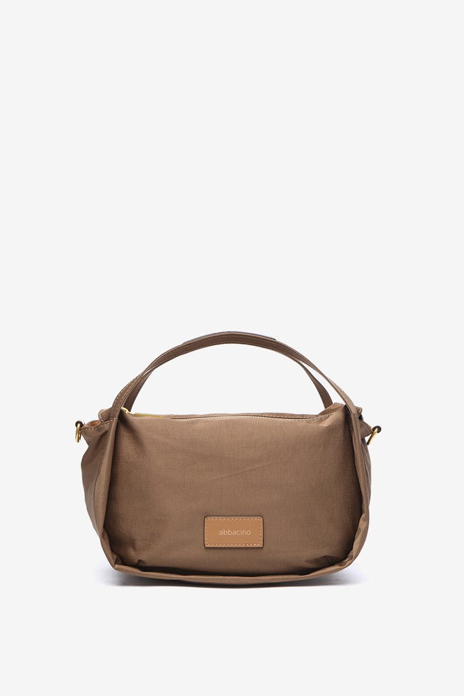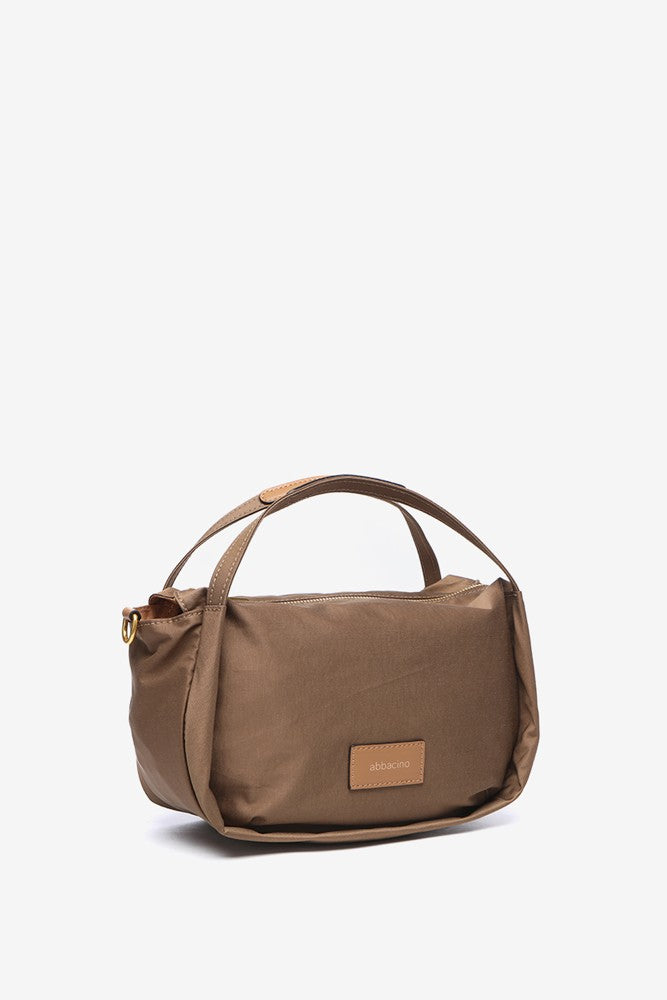 Umhängetasche mit Quaste aus recyceltem Material in Taupe.