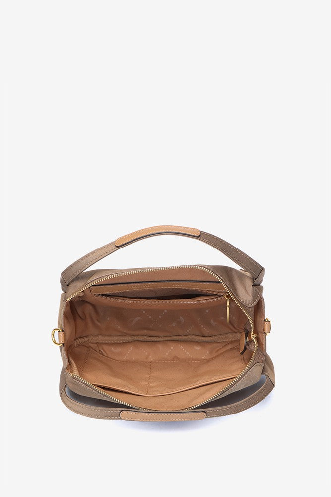 • Sie kombiniert einen Umhängegurt mit zwei kleinen Schultergriffen.