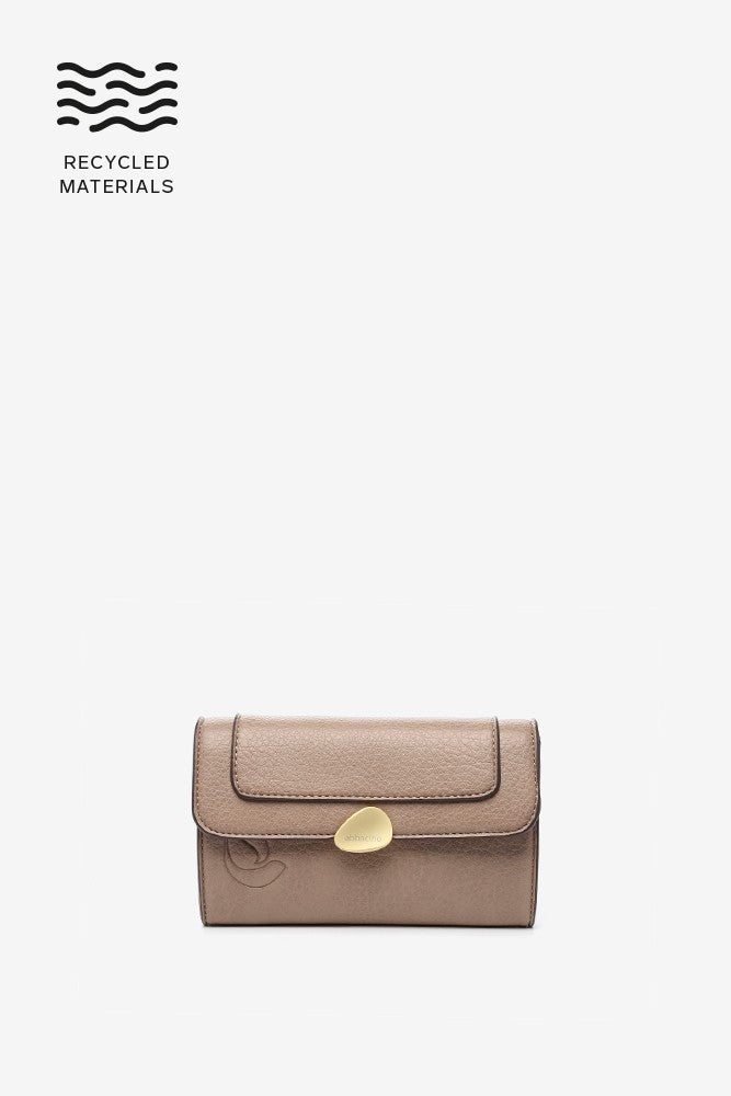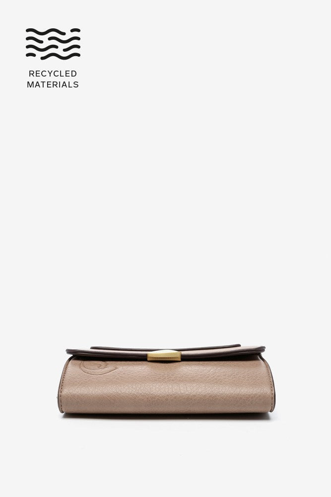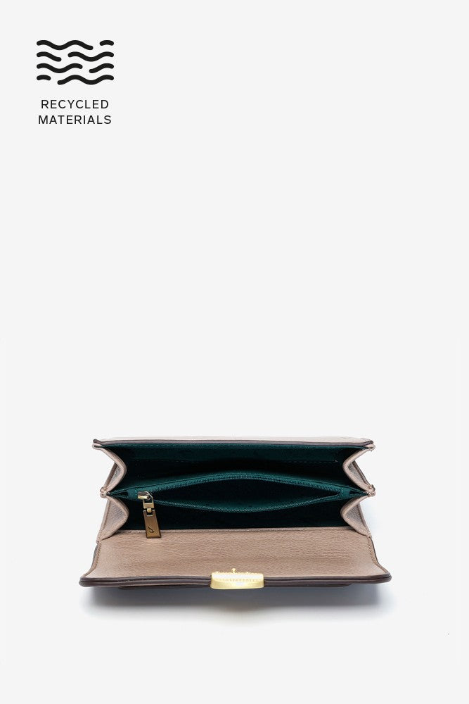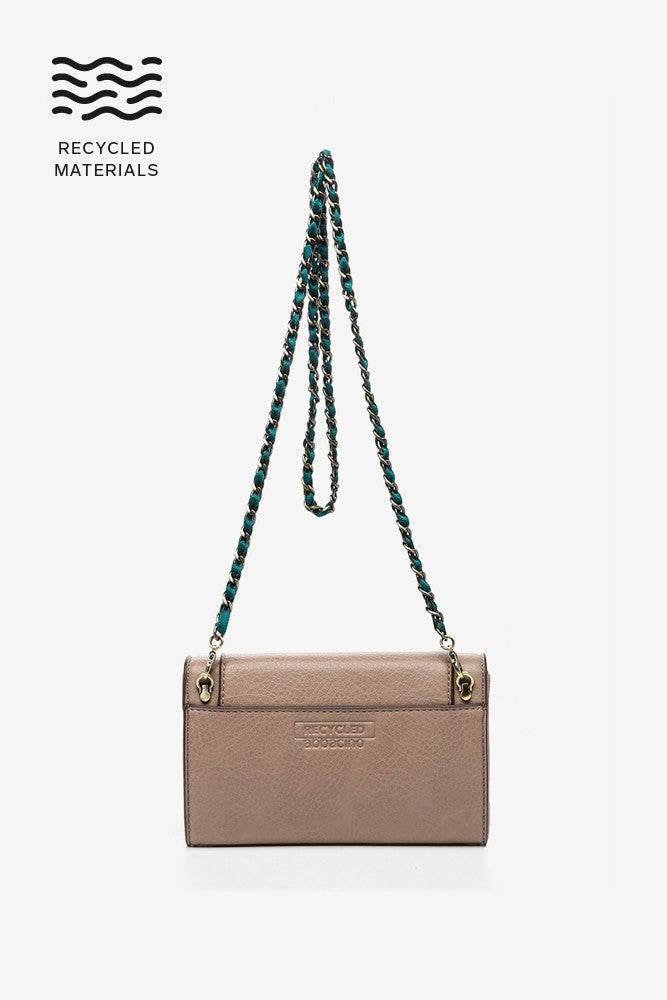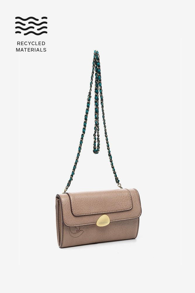 Damentasche aus recycelten Materialien. Ein innovatives Modell in unserer Kollektion, das sich durch seine steife Textur und den vorderen Klappenverschluss auszeichnet, auf dem ein metallisches Detail hervorsticht. Dieses Design mit klassischem und elegantem Schnitt ist perfekt für diejenigen, die ein sehr feminines und schickes Accessoire suchen.