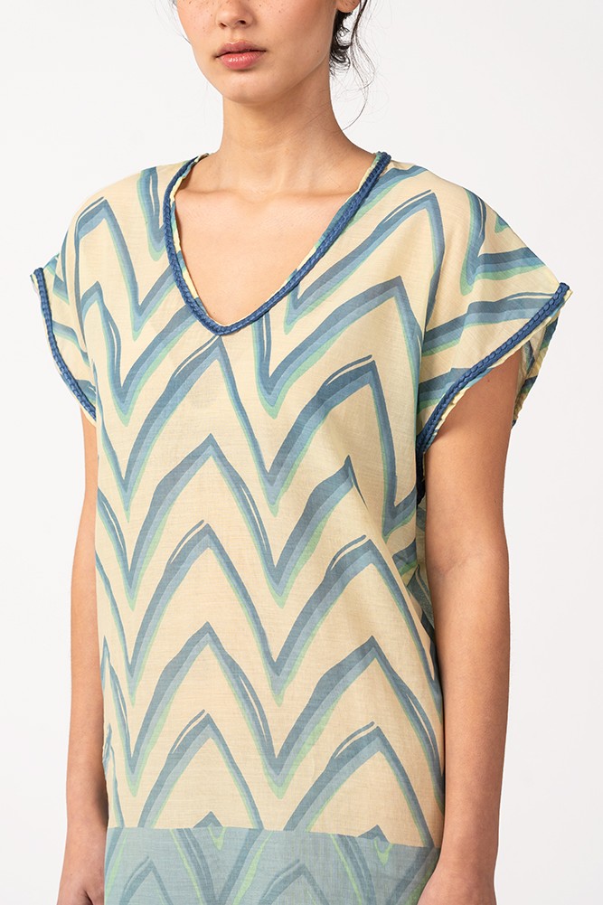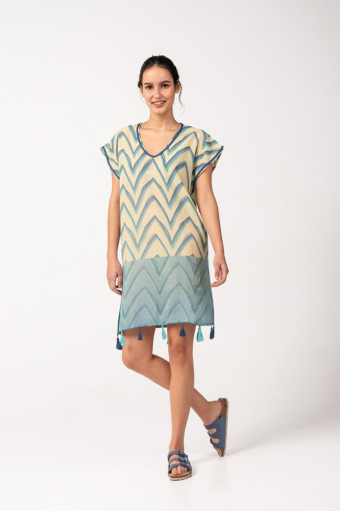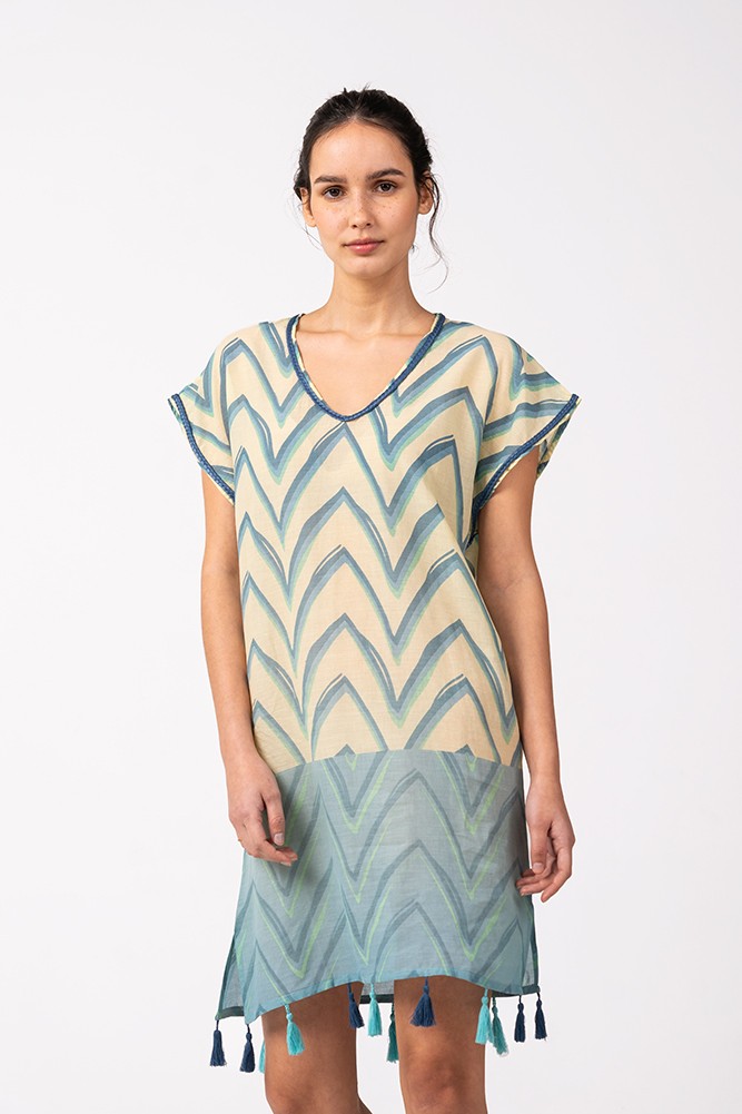 Damenkaftan aus Baumwolle mit einem originellen geometrischen Zickzackmuster. Er kombiniert verschiedene lebendige, sehr frische und sommerliche Farbtöne. Der Stoff ist sehr locker und weich im Griff, weshalb er ein perfektes Accessoire für die heißesten Tage des Jahres ist. Er verfügt über einen vorteilhaften V-Ausschnitt und Quasten am Saum.