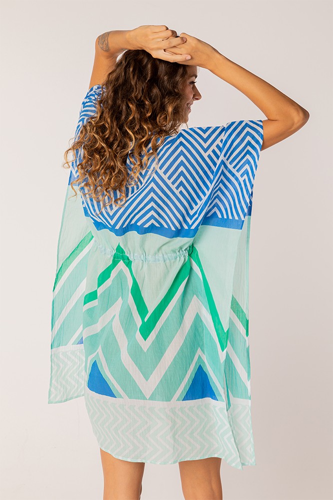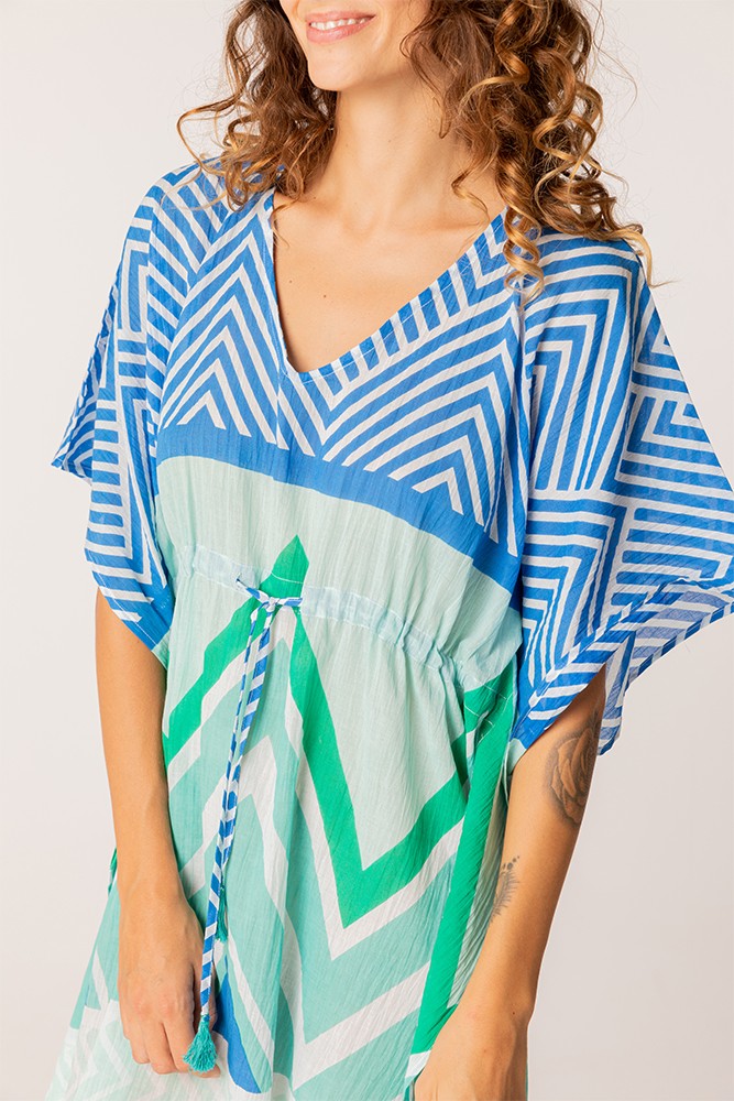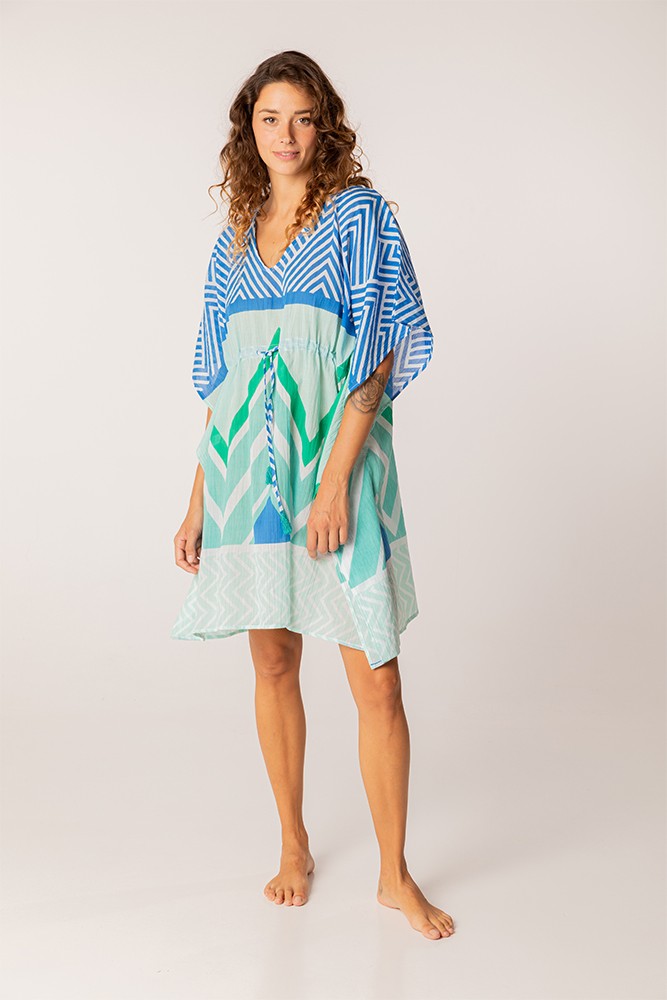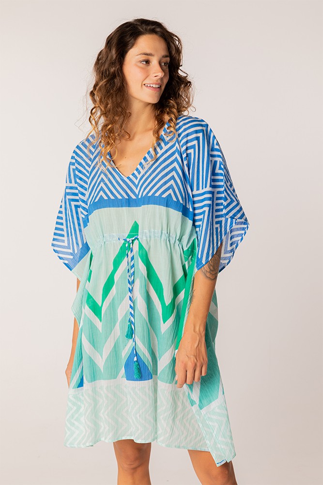 Damenkaftan aus Baumwolle mit einem schönen geometrischen Muster. Der Stoff ist sehr luftig und sanft im Griff, weshalb er ein perfektes Accessoire für die heißesten Tage des Jahres ist. Er verfügt über einen verstellbaren Kordelzug in der Taille, um sich dem Körper anzupassen und zu betonen.