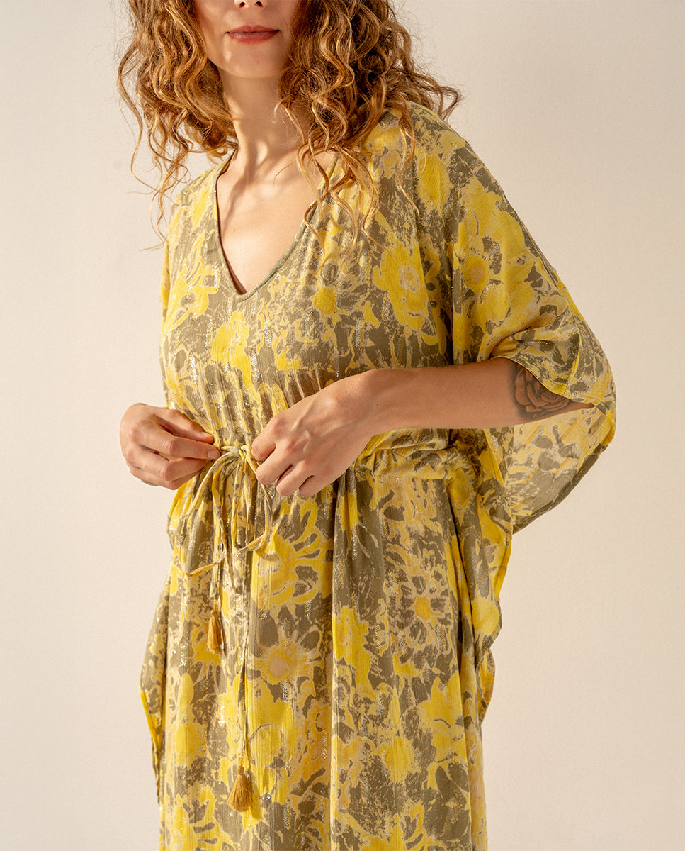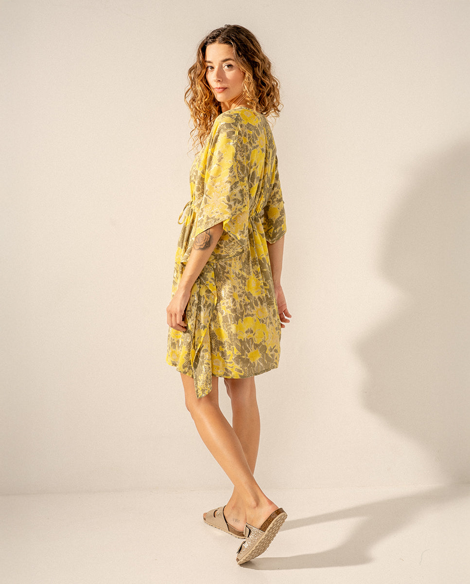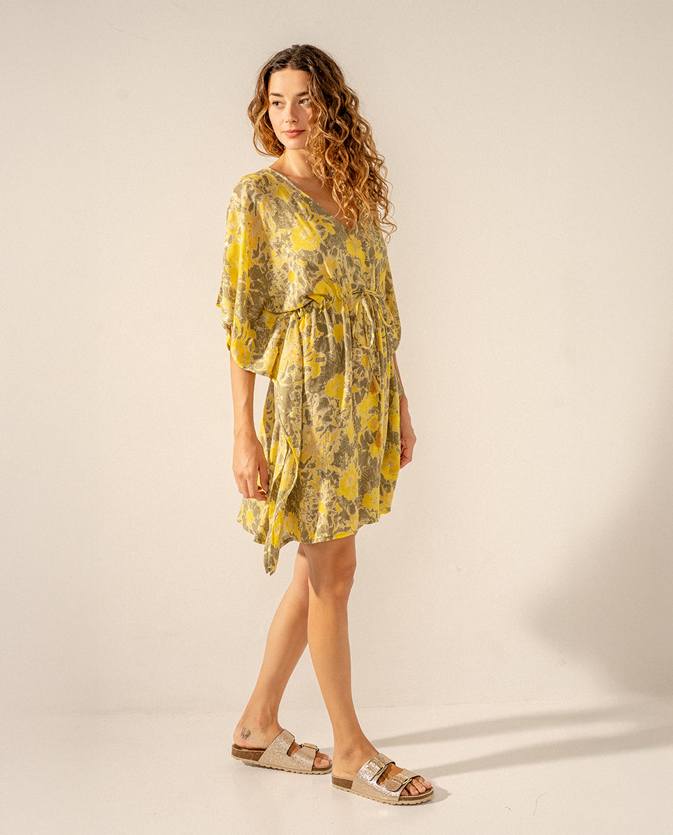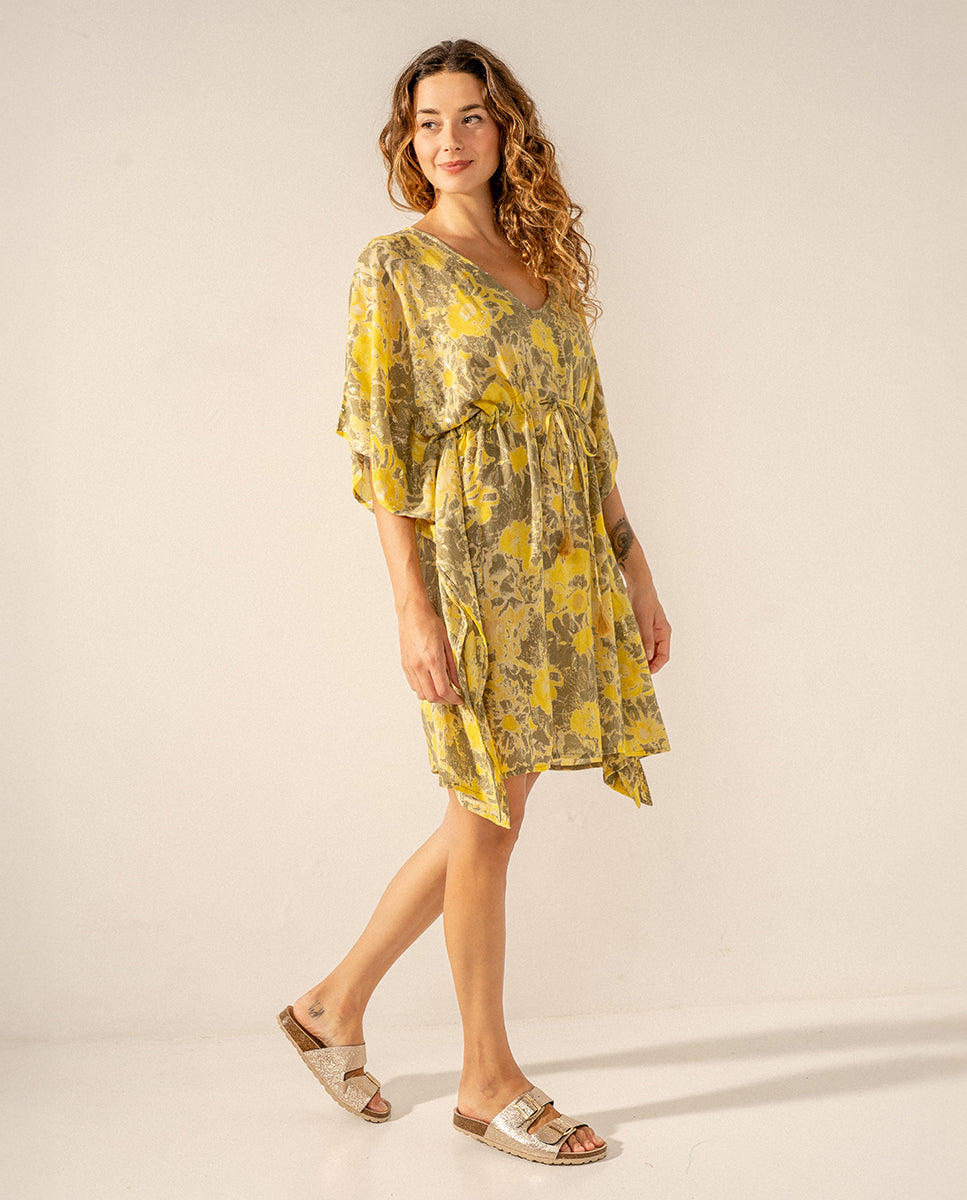 Damenkaftan aus Baumwolle mit abstraktem Aufdruck. Sein Stoff ist sehr locker und fühlt sich weich an, was ihn zu einem perfekten Accessoire macht, das uns an den heißesten Tagen des Jahres begleitet. Es hat einen schmeichelhaften V-Ausschnitt und eine Verstellmöglichkeit mit einer Schleife an der Taille, um die Silhouette zu stilisieren.