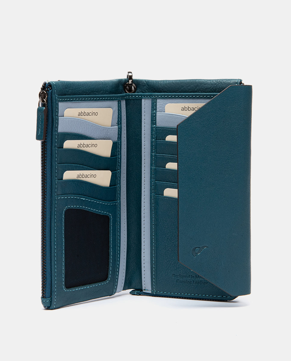• Interior con múltiples ranuras para tarjetas y compartimento para billetes.