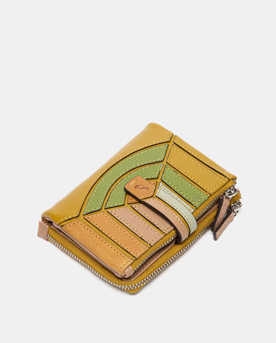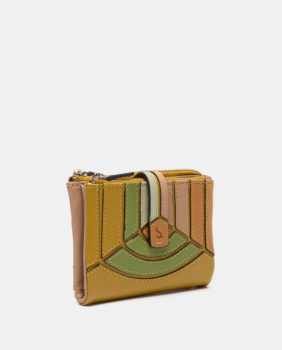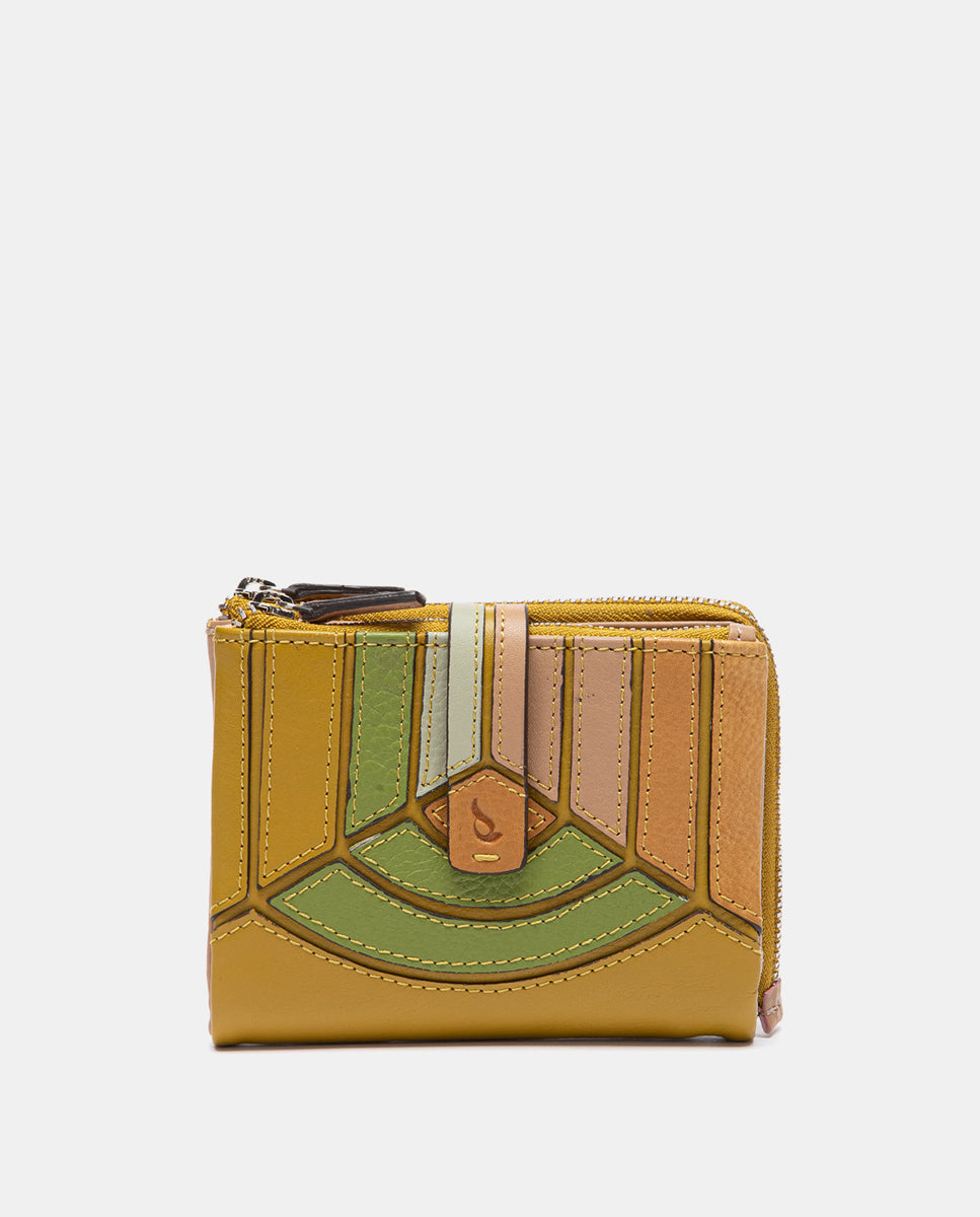 Cartera pequeña de piel con diseño de patchwork en cortes geométricos, cuidadosamente ensamblados para crear una composición única y artesanal. Sus principales características son:
