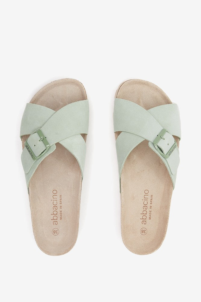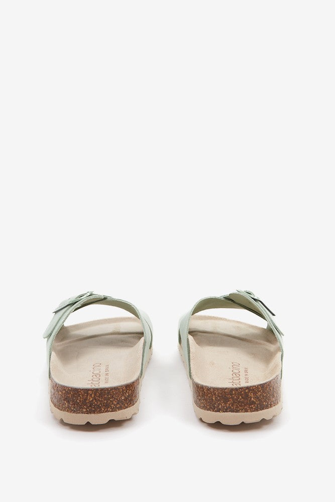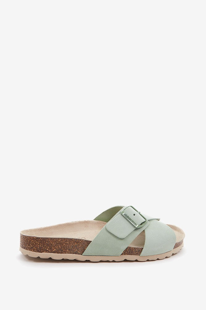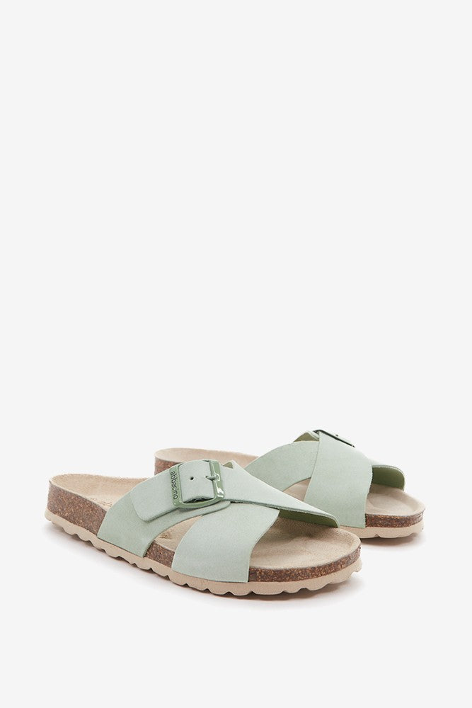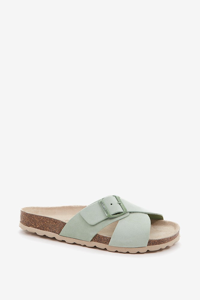 Flache Damen-Sandale mit Schnalle in Grün.