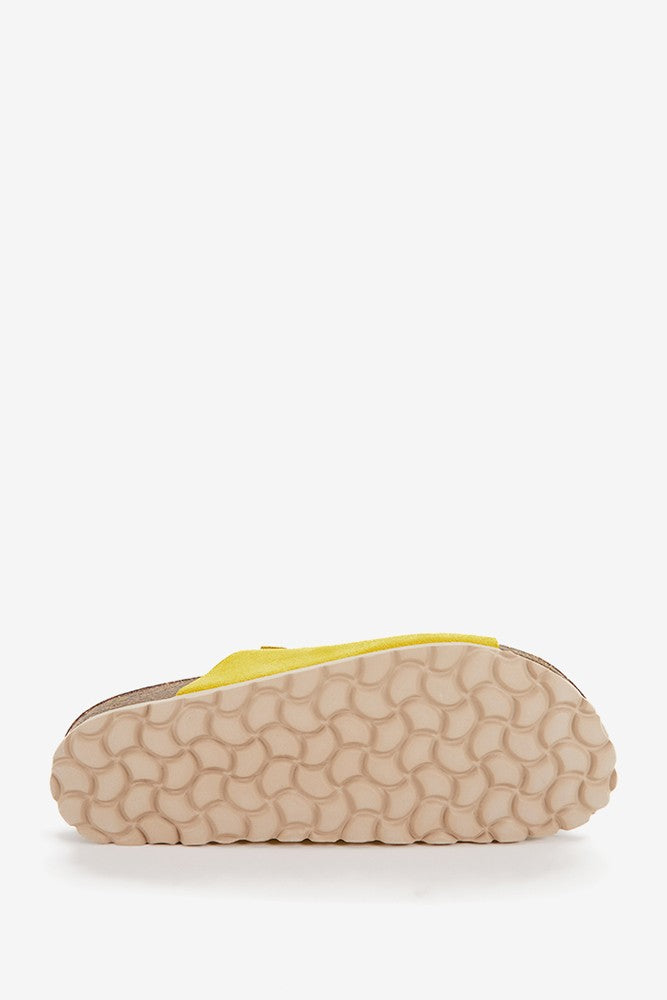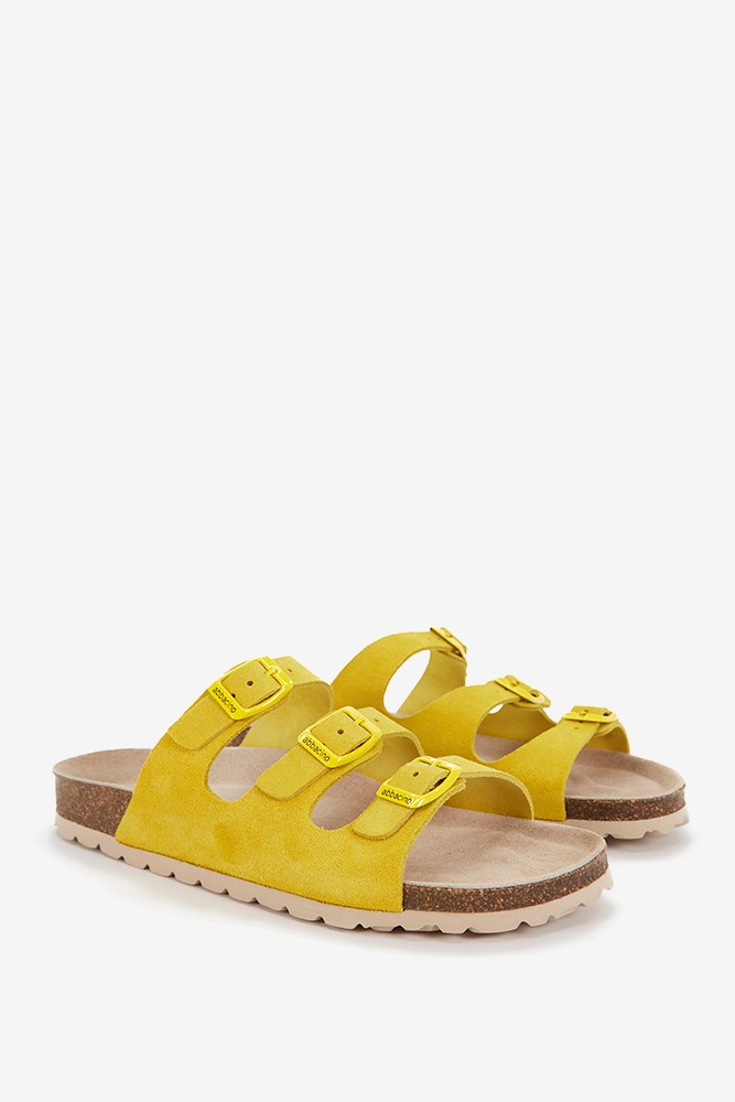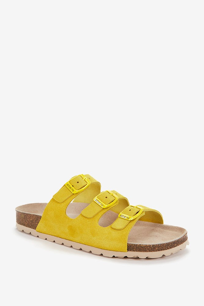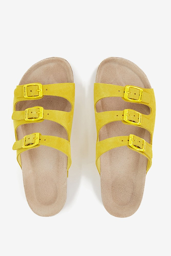 Flache Damenleder-Sandale mit dreifacher Schnalle in Gelb.