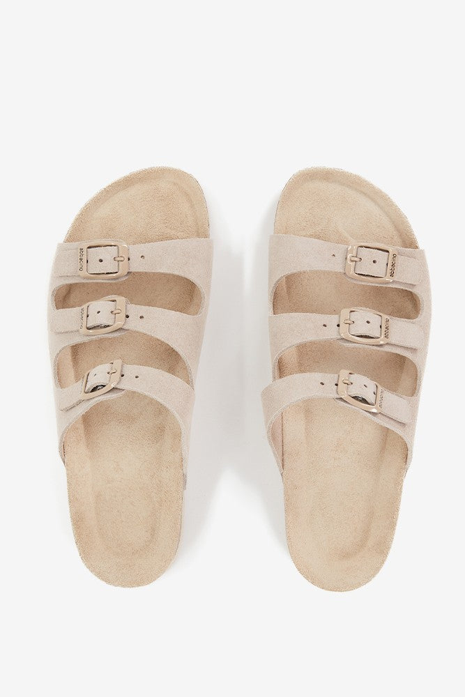 Beige Damen Ledersandale mit dreifacher Schnalle.