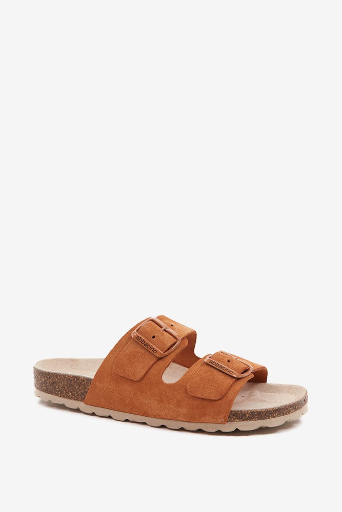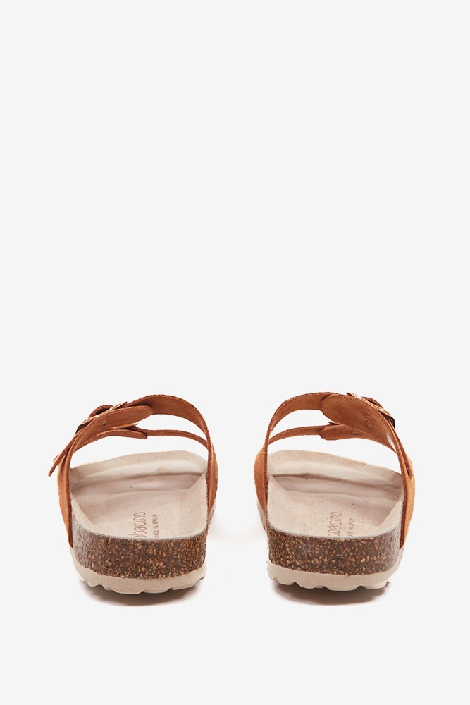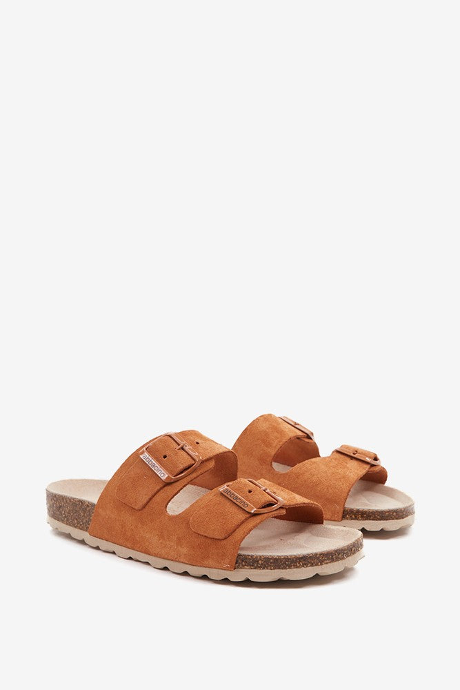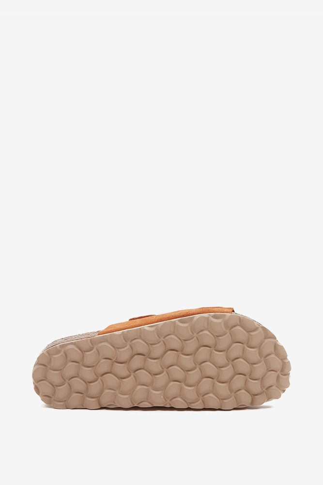 Flache Damen-Sandale aus Veloursleder in Cognac.