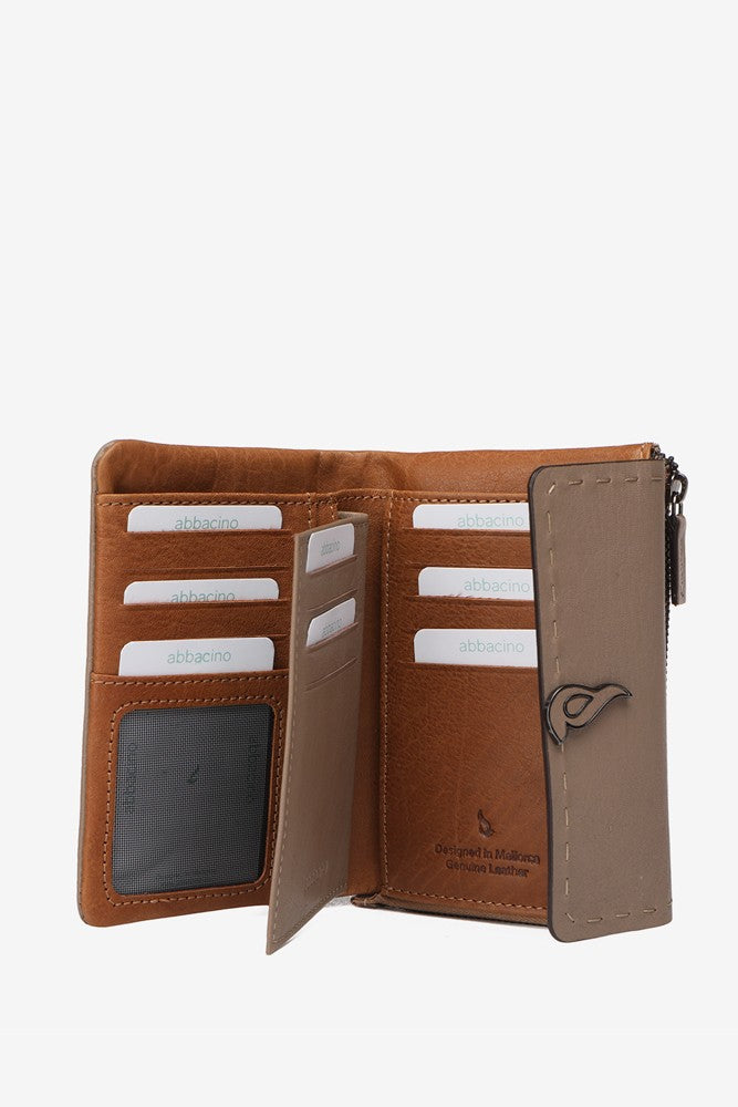 Kleine Damenbörse aus Premium-Leder. Ein klassisches Modell mit schlichten Linien und herbstlichen Farben, das durch seinen Klappenverschluss mit dem Abbacino-Logo in der Mitte besticht. Kompakt und perfekt organisiert, verfügt sie über mehrere Kartenfächer, einen Platz für den Personalausweis, ein Fach für Geldscheine und ein abnehmbares Kartenetui. An der Außenseite befindet sich ein großes Münzfach mit Reißverschluss. Das ideale Accessoire, um es mit Mini-Handtaschen wie Umhängetaschen zu kombinieren.