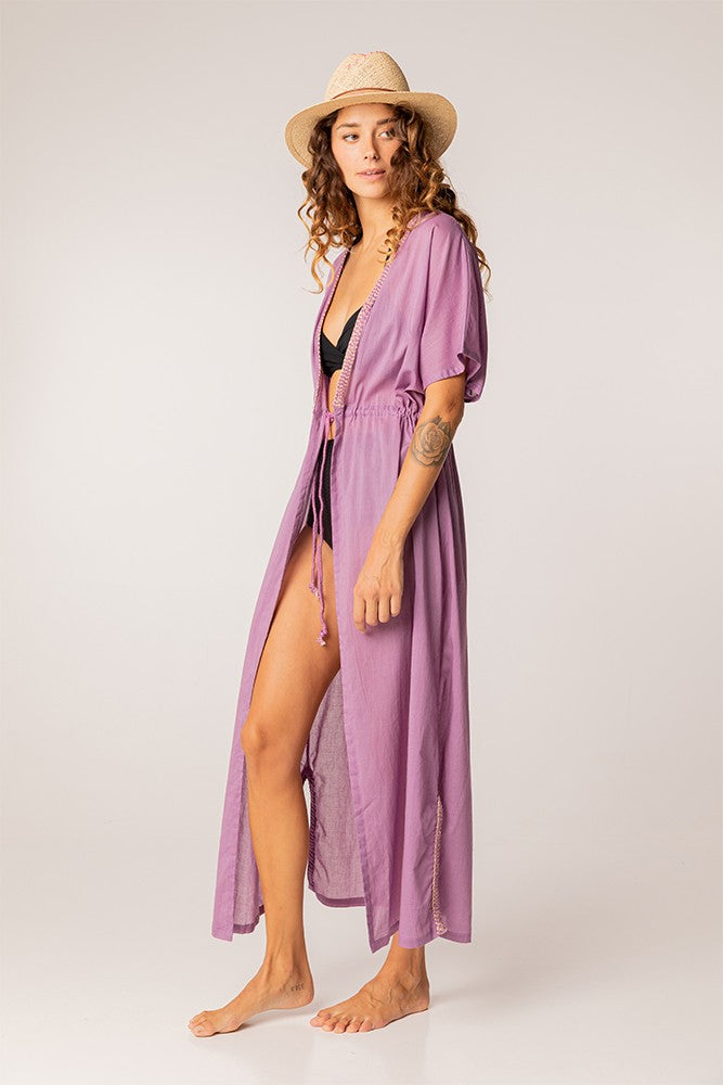 Langer Damen-Kimono, ideal für Strandtage und sogar für einen Spaziergang bei Sonnenuntergang. Ein einfarbiges Design mit einem schönen gestickten Applikation im Bereich des Ausschnitts. Er hat einen Kordelzug in der Taille, der es ermöglicht, ihn anzupassen und am Körper zu betonen.