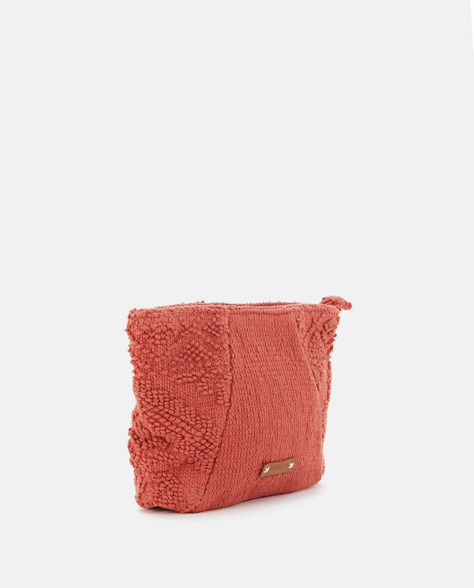 Strand-Kulturbeutel aus Stoff mit Stickerei im Ethno-Stil, der sich durch seine sommerlichen Farben und seine Zweckmäßigkeit auszeichnet. Seine Hauptmerkmale sind: