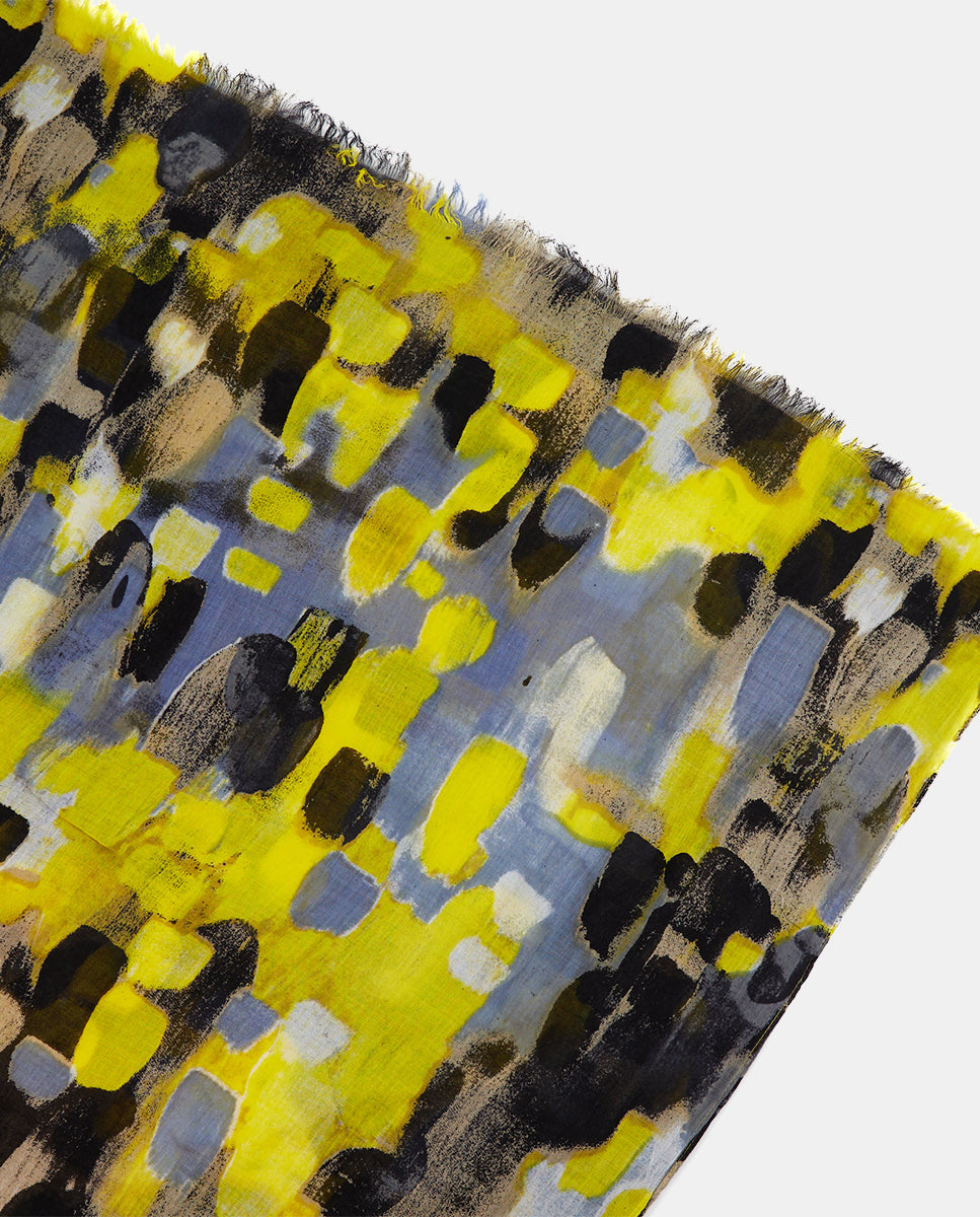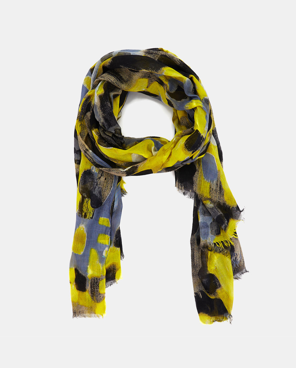 Pañuelo de mujer de viscosa con un estampado abstracto. Su mezcla de tonalidades genera un atractivo y vibrante juego de colores, perfecto para complementar cualquier conjunto de verano. Los bordes deshilachados le dan un toque casual y relajado.