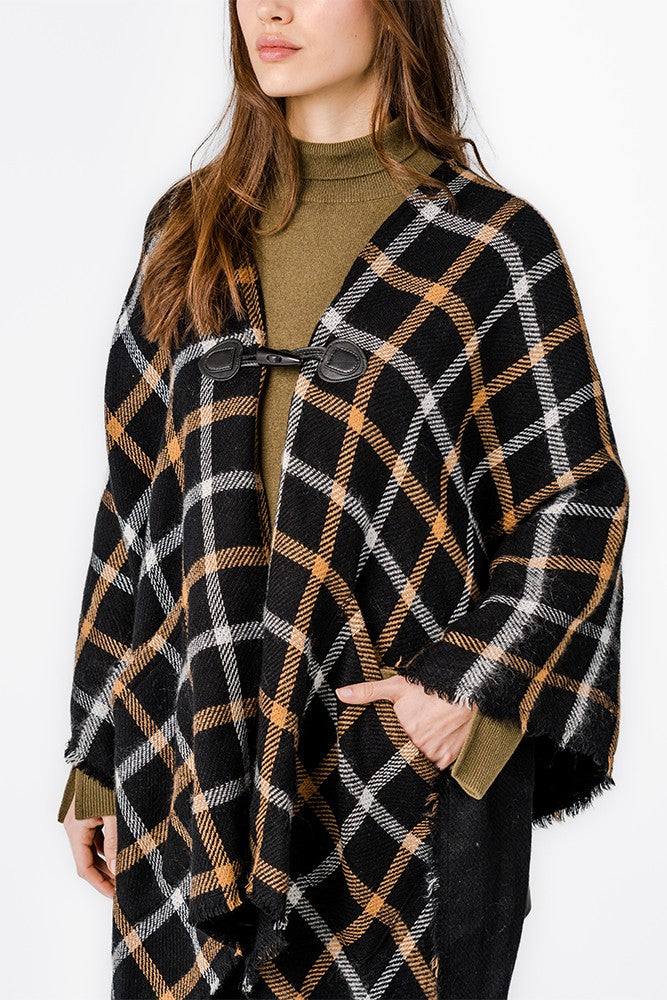 Damen-Poncho in Schwarz mit einem schönen Karomuster. Der Stoff fühlt sich ultraweich an und ist sehr warm, perfekt für die Herbst- und Wintertage. Die Enden sind ausgefranst und zudem verfügt er über einen frontalen Verschluss mit Knebel, der für Trenchcoats typisch ist, um ihn besser am Körper anzupassen. Ein ideales Accessoire, um deinen täglichen Looks einen modernen und lässigen Touch zu verleihen.