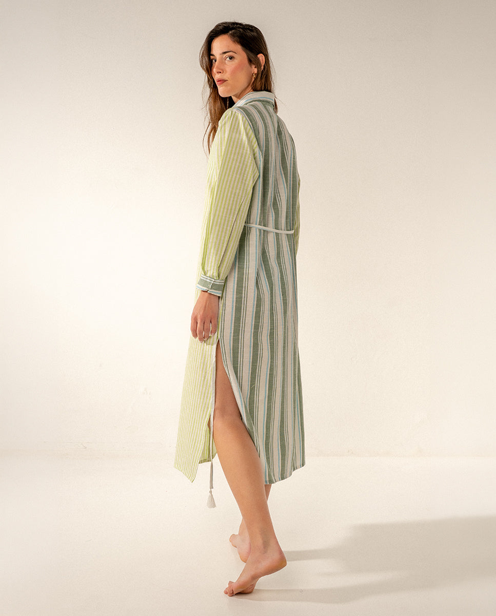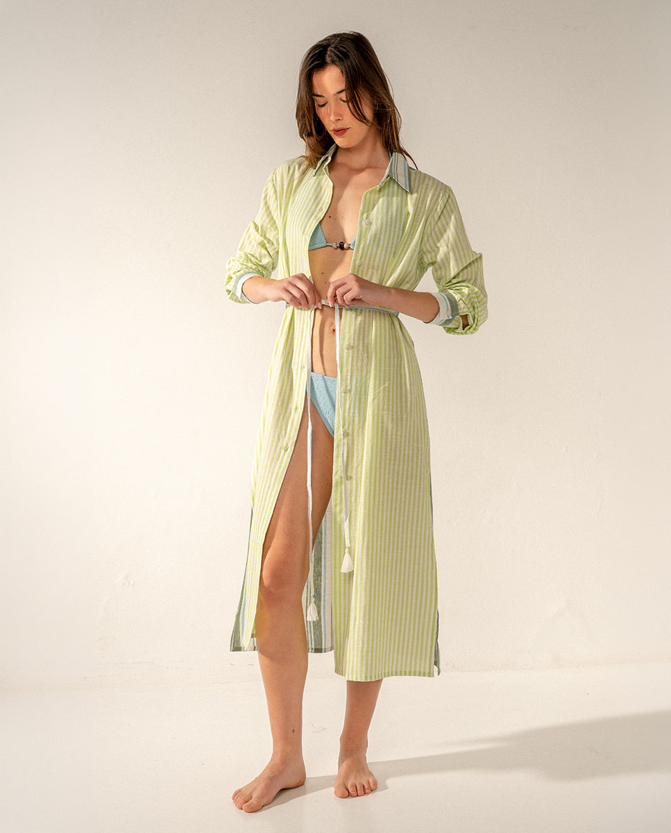 Lange Damentunika aus Viskose mit Streifenprint, ideal für heiße Tage dank des weichen, lockeren und hoch atmungsaktiven Stoffes. Sein vielseitiges Design kombiniert zwei Arten von Streifen, einen auf der Vorderseite und einen auf der Rückseite, und ermöglicht es Ihnen, es sowohl am Strand als auch bei einem Nachmittagsspaziergang zu tragen und sorgt für Stil, ohne auf Komfort zu verzichten. Es hat Knöpfe auf der Vorderseite.