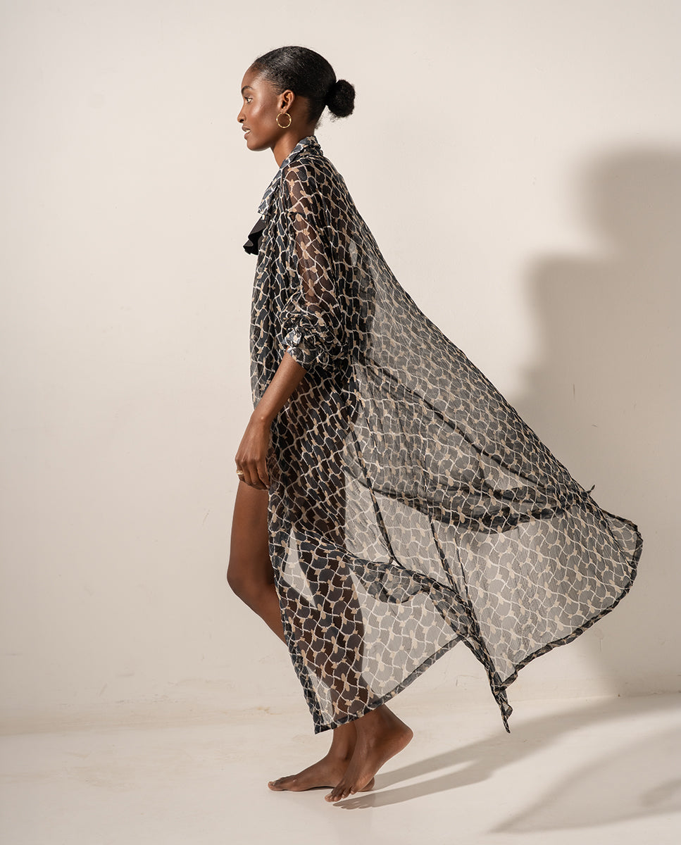 Lange halbtransparente Viskose-Tunika für Damen mit geometrischem Aufdruck. Ein sehr vielseitiges Design, das es Ihnen ermöglicht, es für einen Tag am Strand oder für einen Nachmittagsspaziergang zu verwenden. Sein weicher, lockerer Stoff ist sehr atmungsaktiv, ideal für heiße Tage. Es hat Knöpfe auf der Vorderseite.
