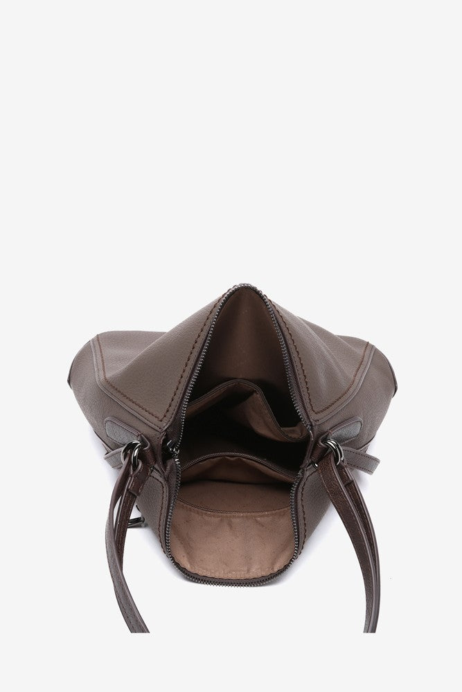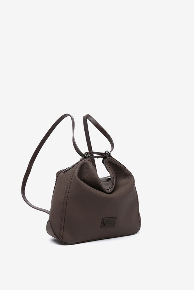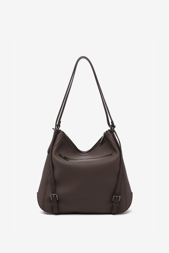 Convertible women's bag into a backpack made from recycled materials. Classic, simple, and timeless, this design will become a staple in your daily life thanks to the simplicity of its lines, its multifunctionality, and its autumnal colors. It features leather-like details, such as its handles or a small patch with the brand logo, which stand out against the main color of the bag.