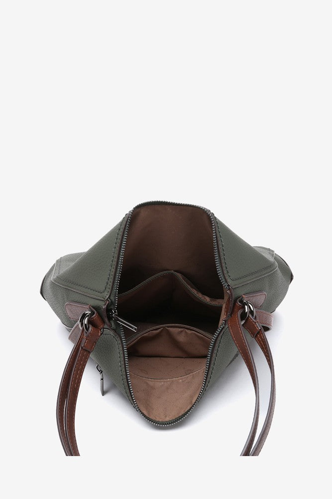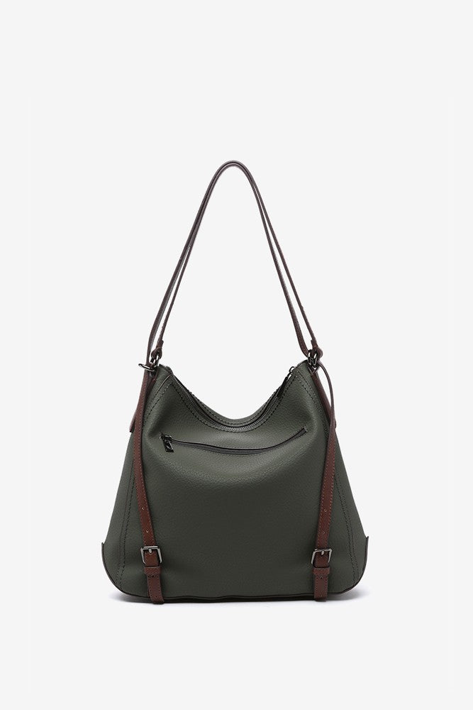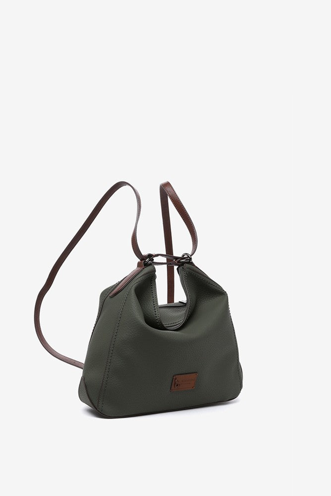 Convertible women's bag into a backpack made from recycled materials. Classic, simple, and timeless, this design will become a staple in your daily life thanks to the simplicity of its lines, its multifunctionality, and its autumnal colors. It features leather-like details, such as its handles or a small patch with the brand logo, which stand out against the main color of the bag.