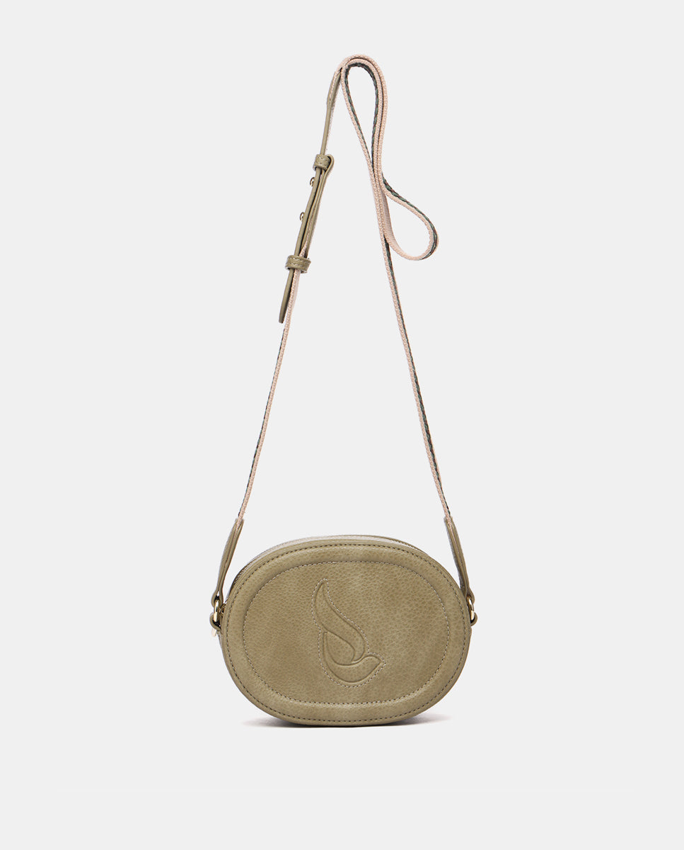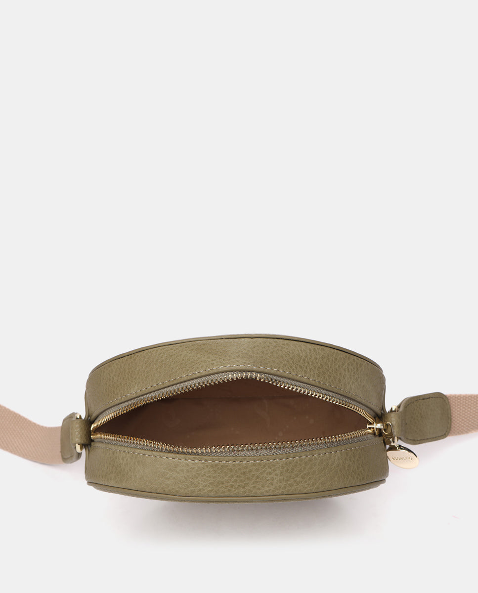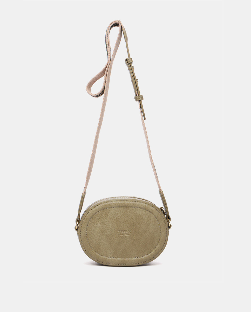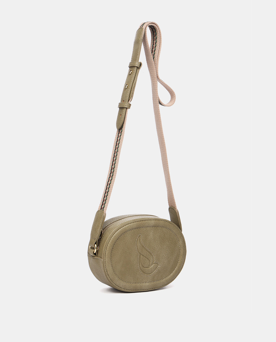 Women's circular-shaped crossbody bag crafted with recycled materials. A cute design with a rigid texture, youthful and trendy, suitable for both day and night use. Its main features include: