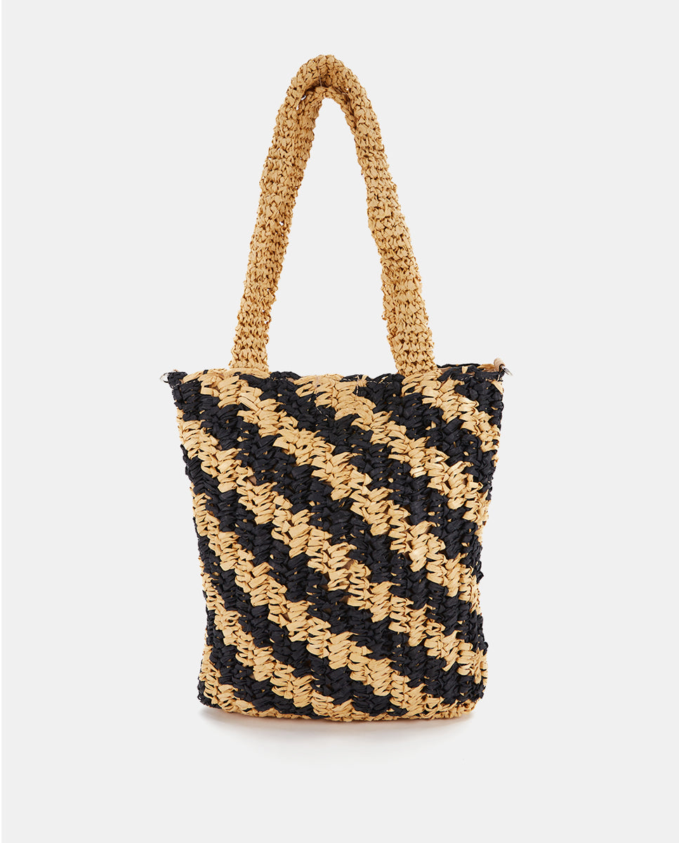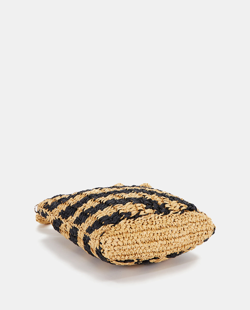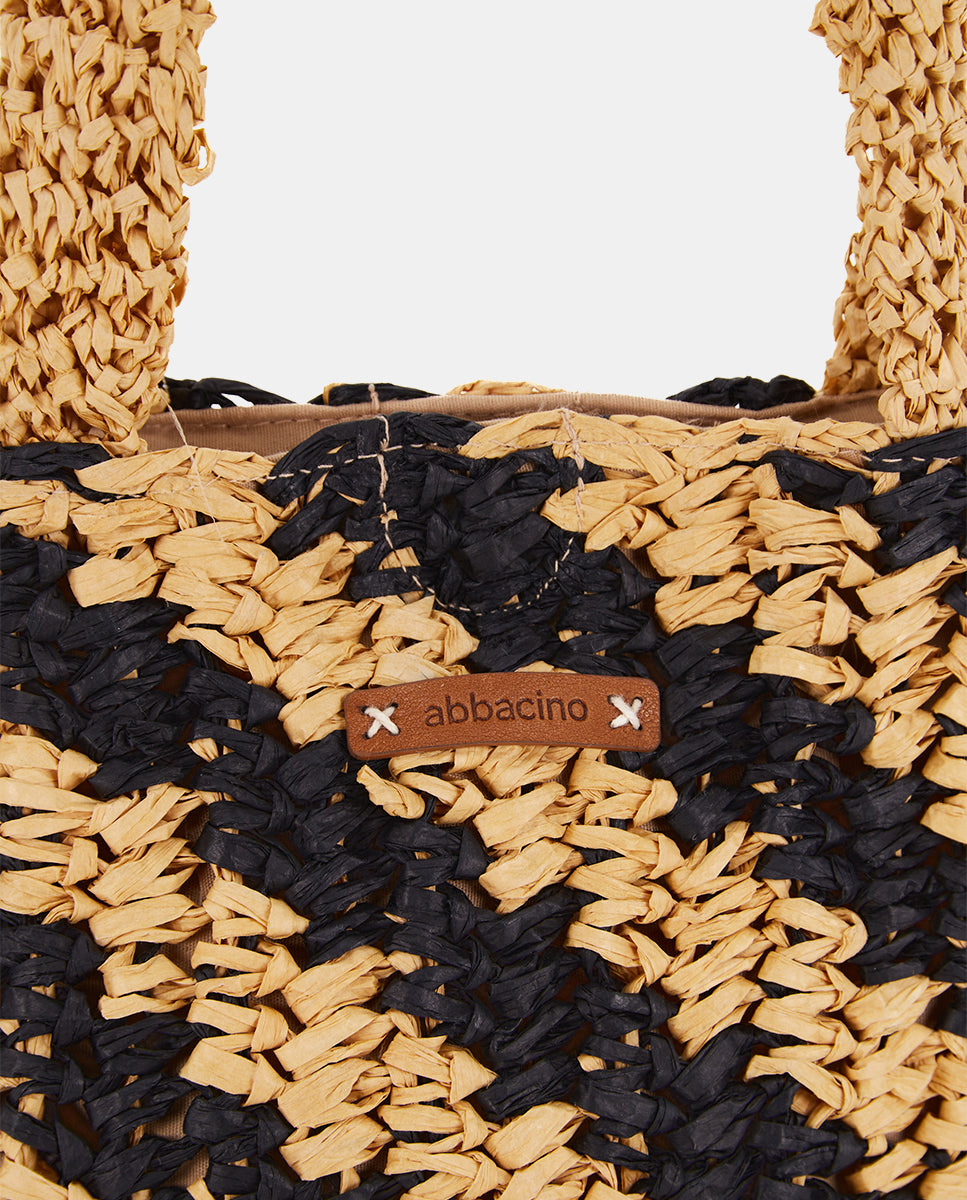 Women's handbag crafted from woven natural fibers with a linear contrast print in black. A perfect design to add a carefree and very trendy touch to your summer looks. Its key features are: