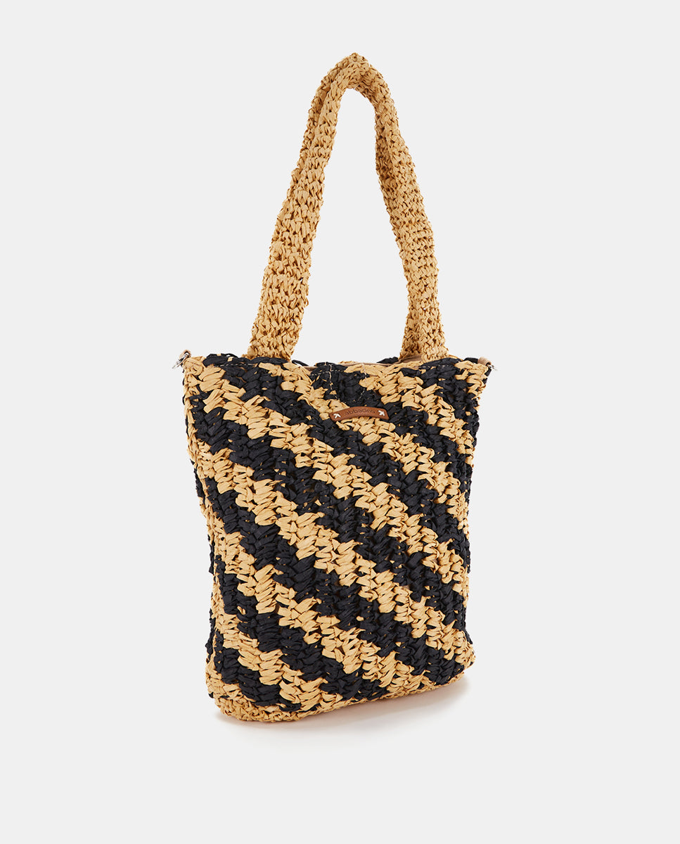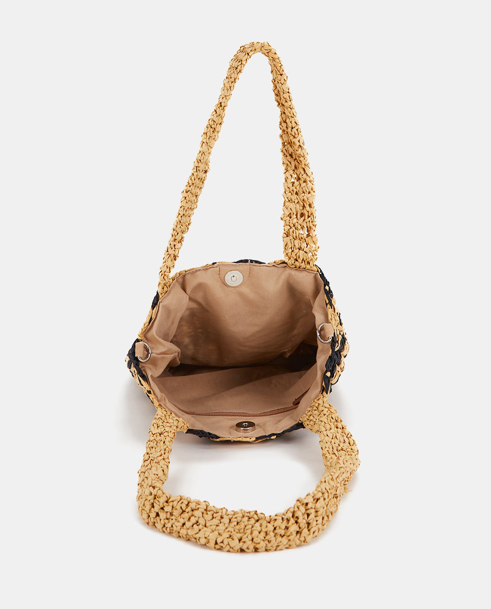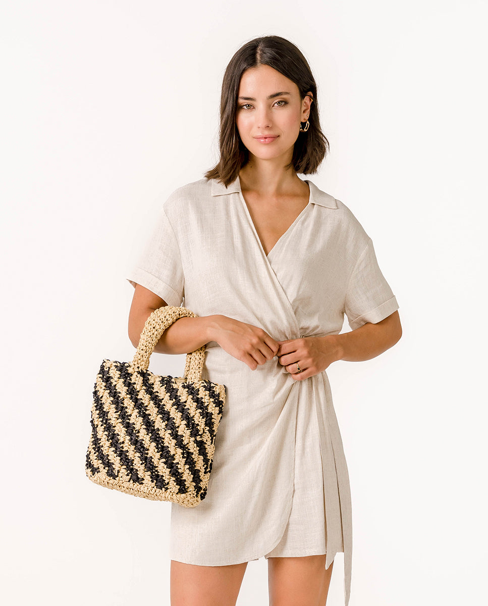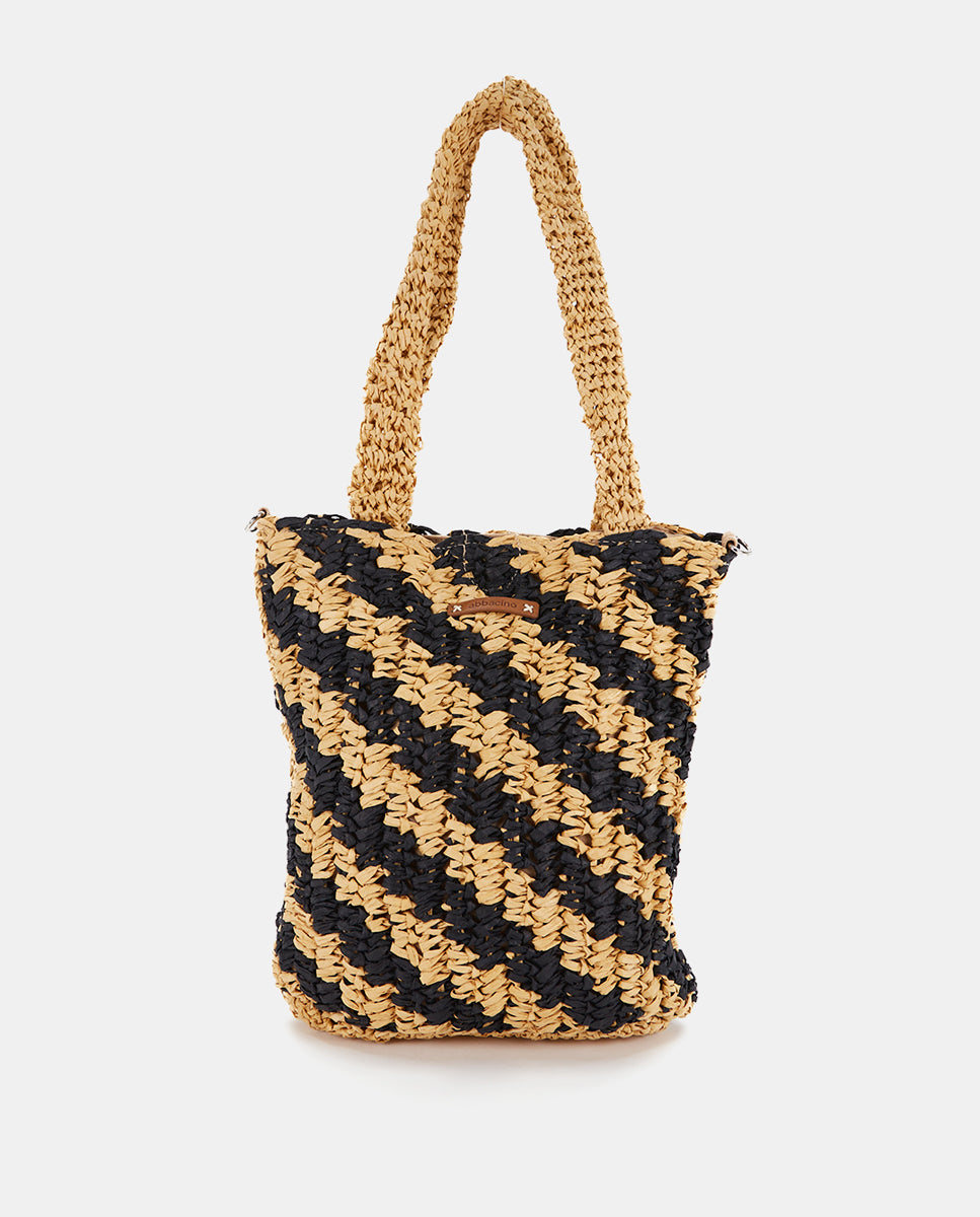 Women's handbag crafted from woven natural fibers with a linear contrast print in black. A perfect design to add a carefree and very trendy touch to your summer looks. Its key features are: