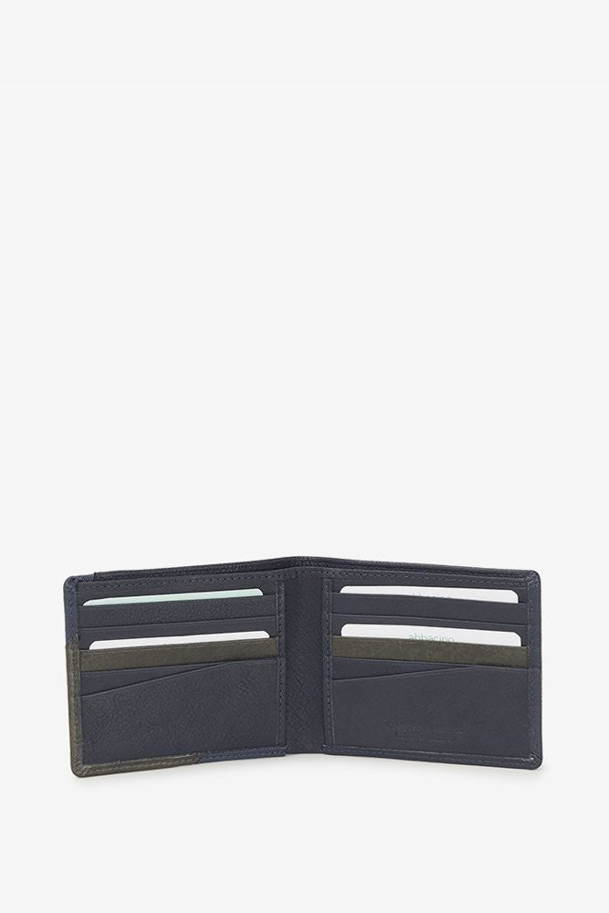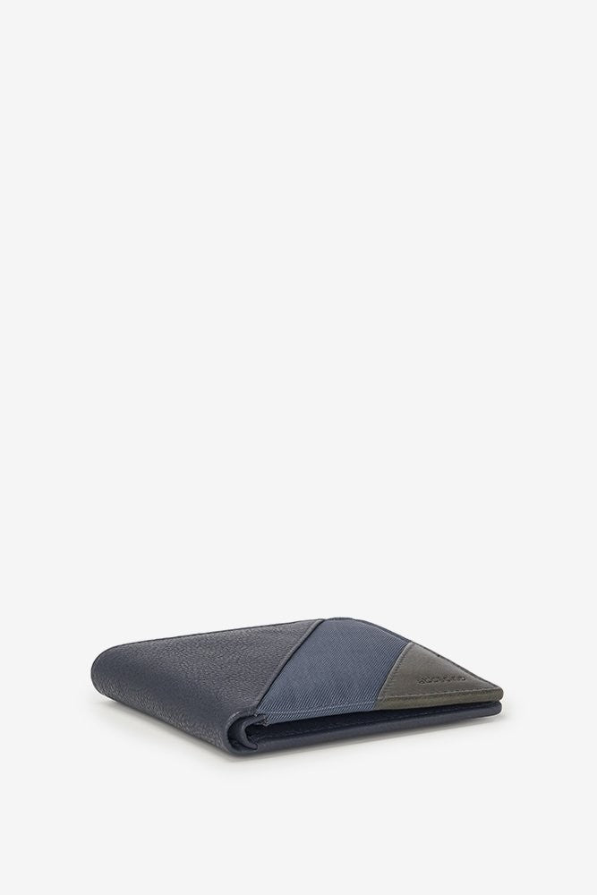 A high-end leather men's American wallet. Handcrafted. A modern masculine design highlighted by the piece of canvas in the middle and the sophisticated range of colours. Room inside for plenty of cards with different sleeves and a banknote holder. Engraved brand logo.