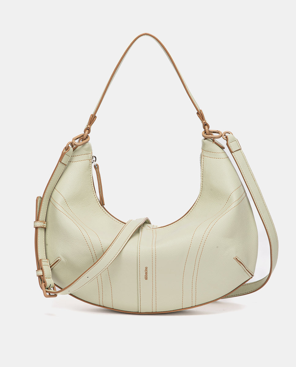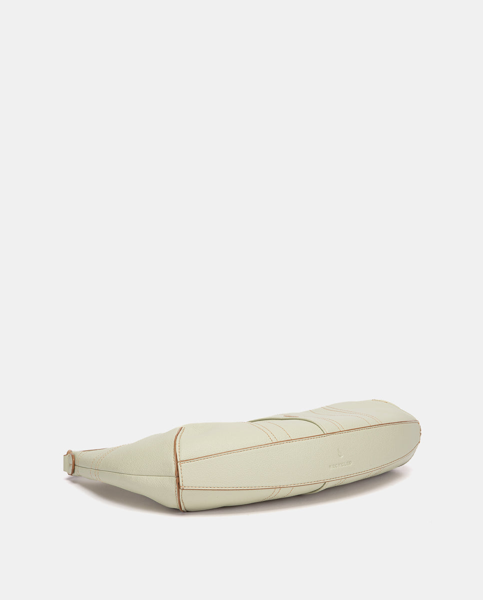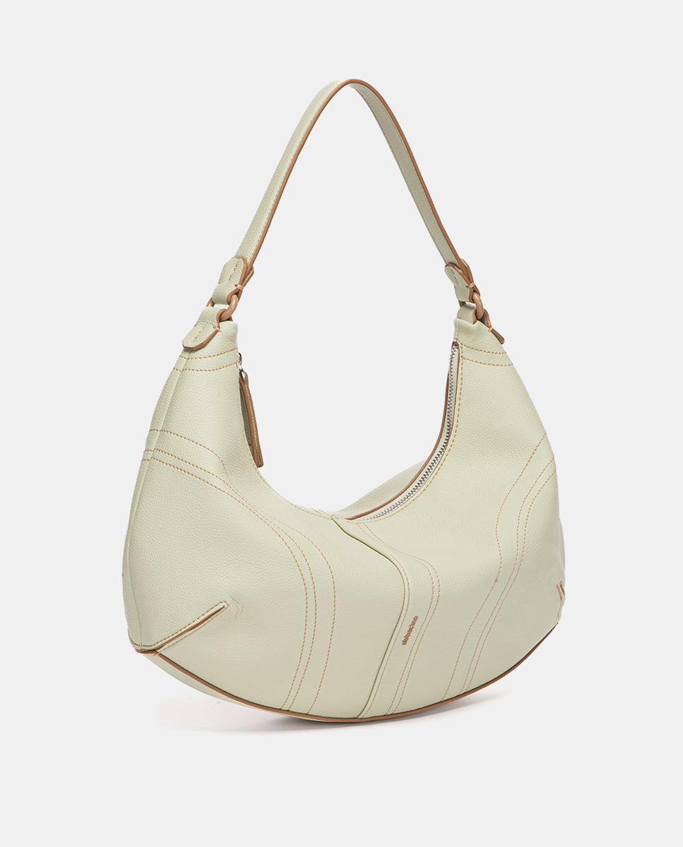 Small hobo-style shoulder bag, made from recycled materials with a textured finish and visible stitching that enhance its elegant and versatile design, perfect for any occasion. Its flexible and lightweight structure makes it comfortable for daily use. Its main features are: