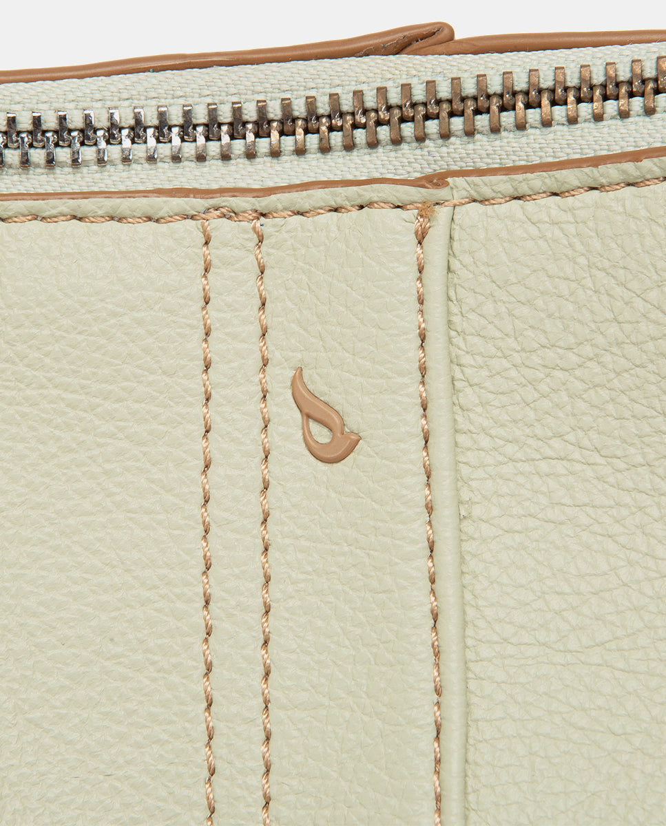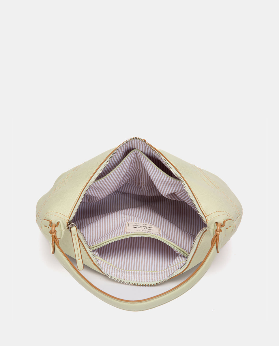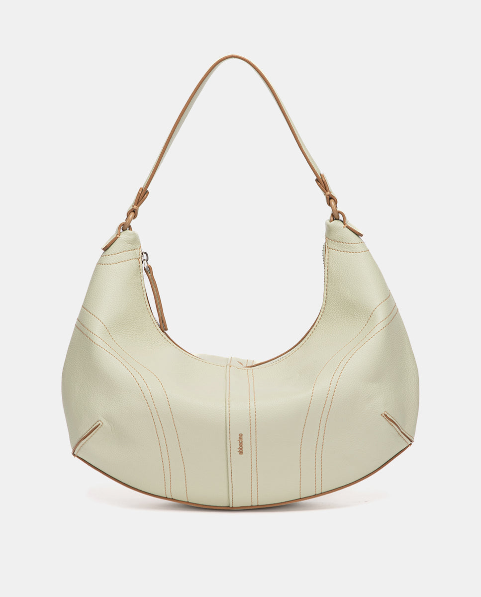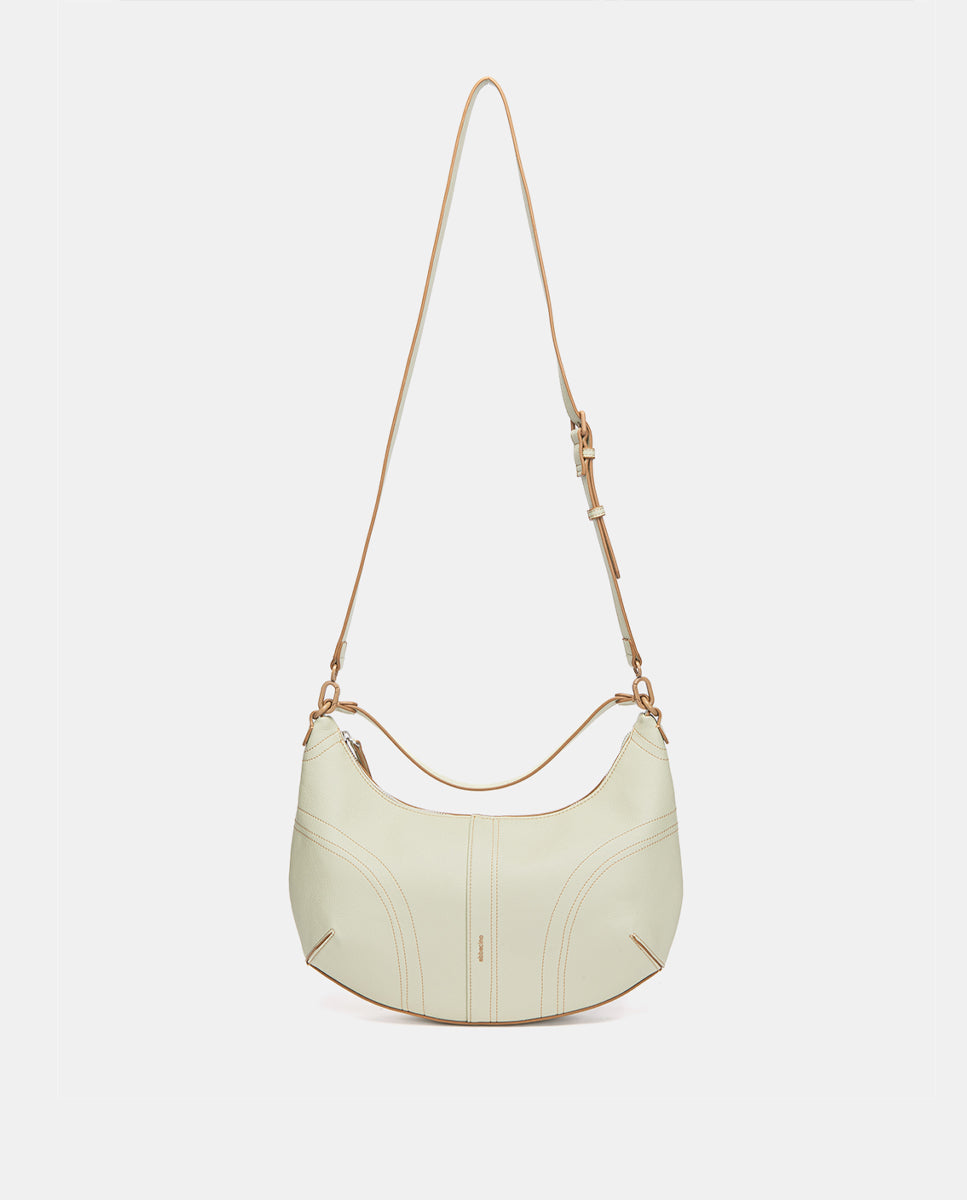 Small hobo-style shoulder bag, made from recycled materials with a textured finish and visible stitching that enhance its elegant and versatile design, perfect for any occasion. Its flexible and lightweight structure makes it comfortable for daily use. Its main features are: