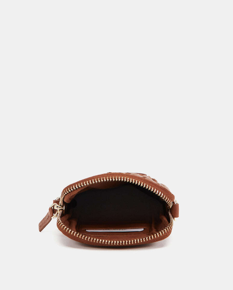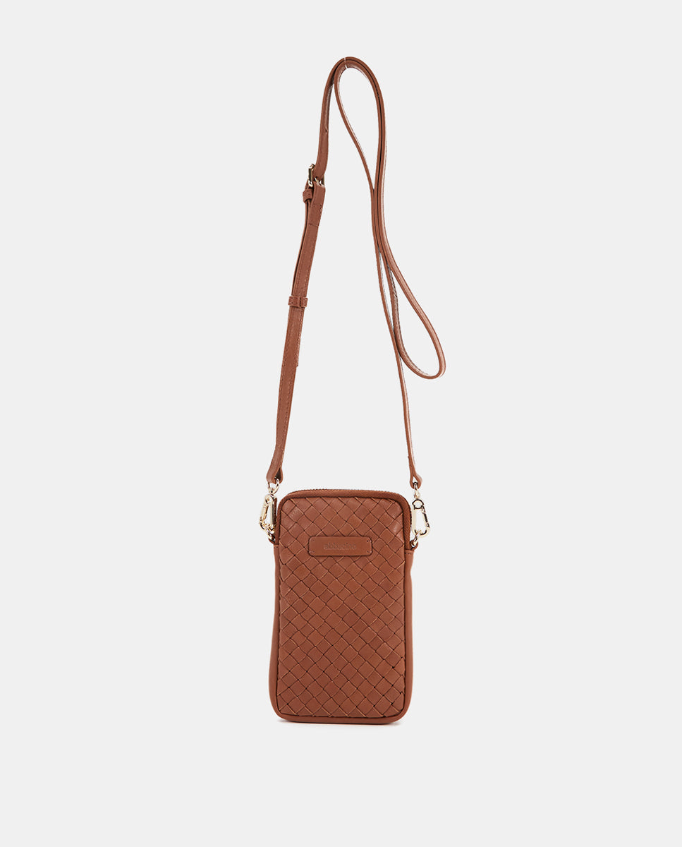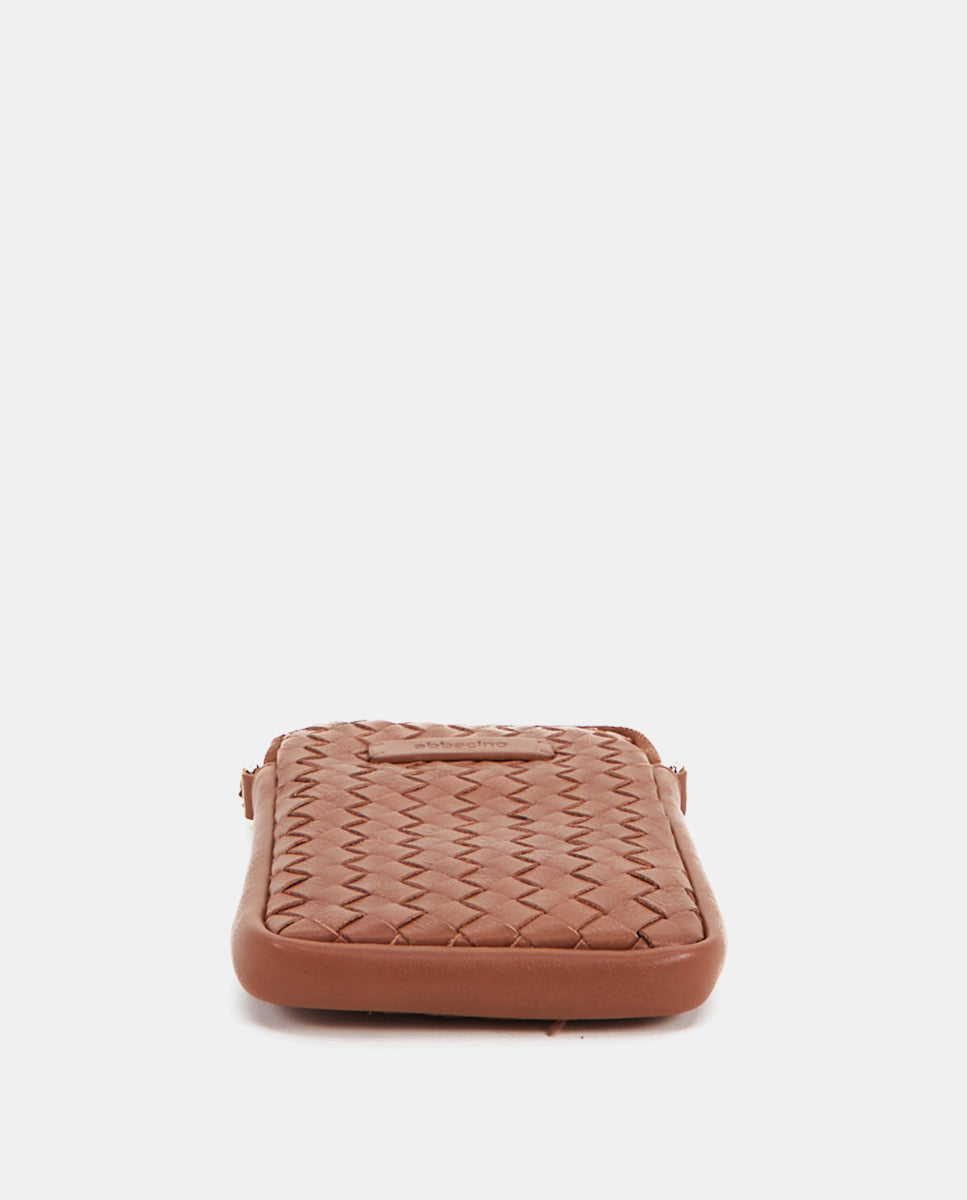 Braided leather mobile phone bag in cognac