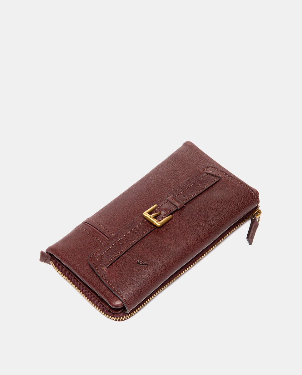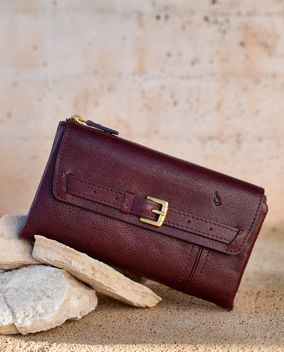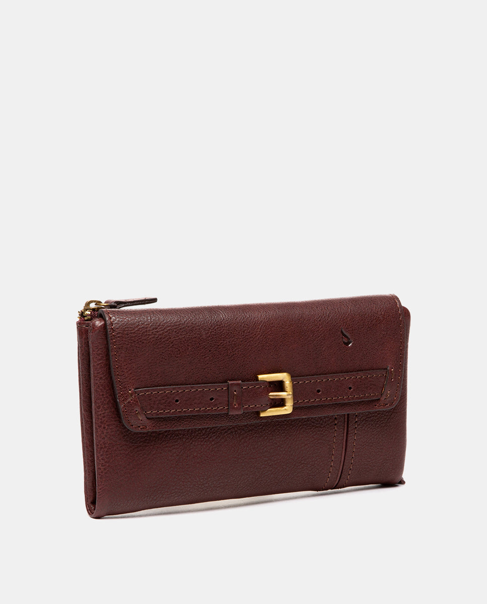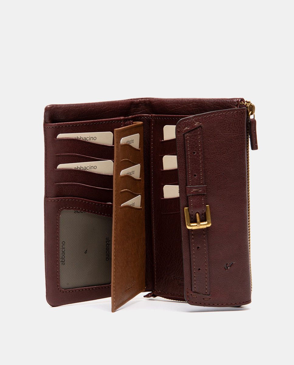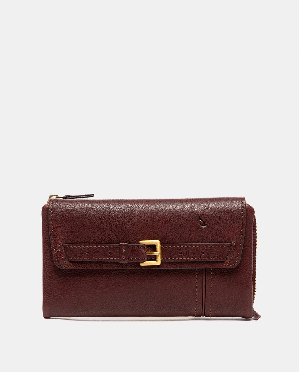 Large women's leather wallet with a design that stands out for its front flap closure, which features a decorative gold buckle. Elegant and functional, it's ideal for those looking for organization and style. Its main features include: