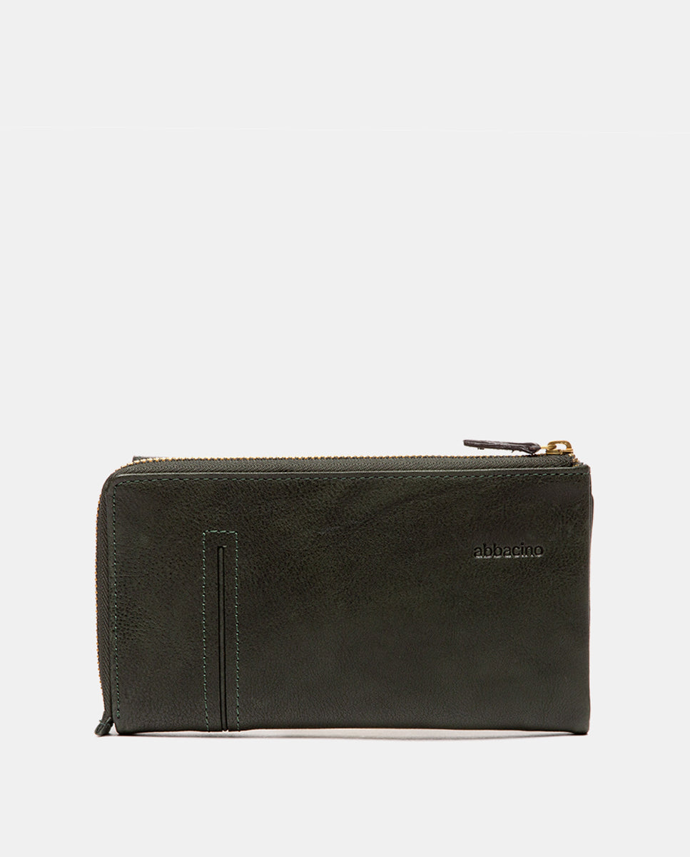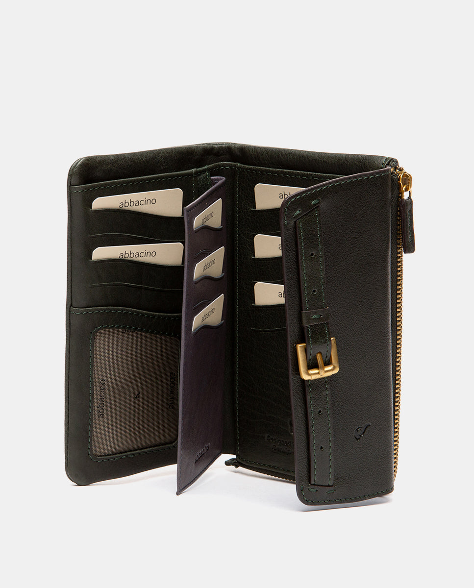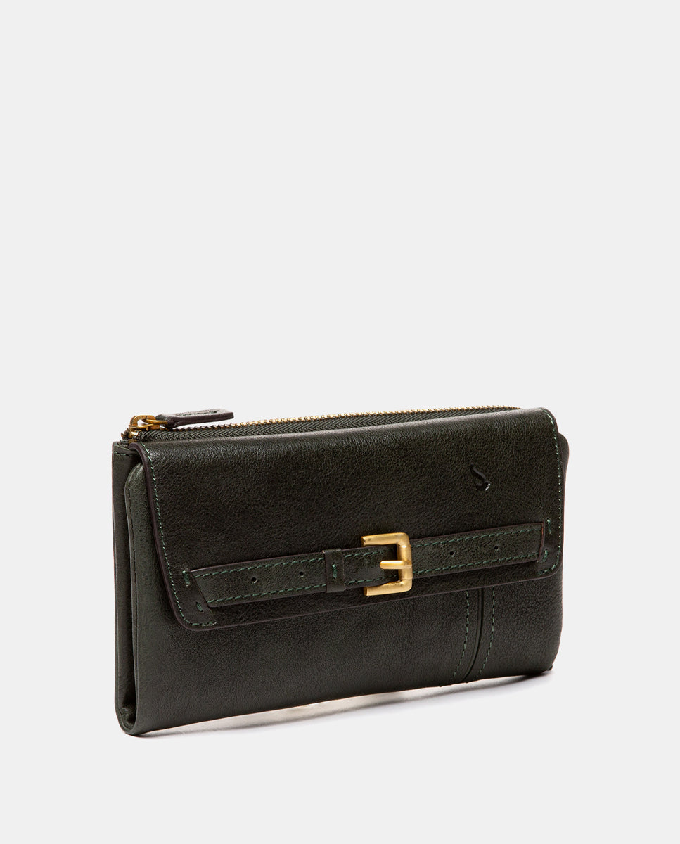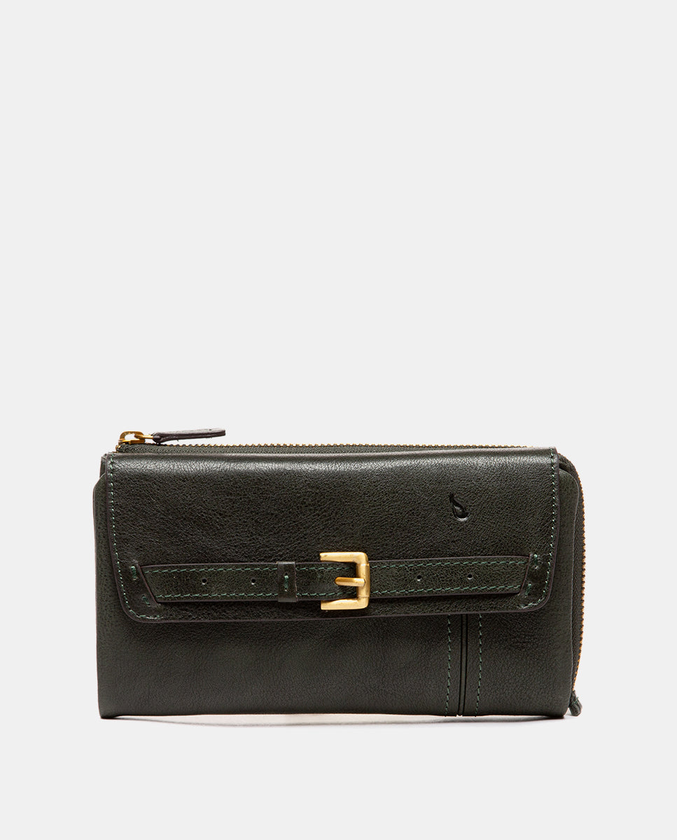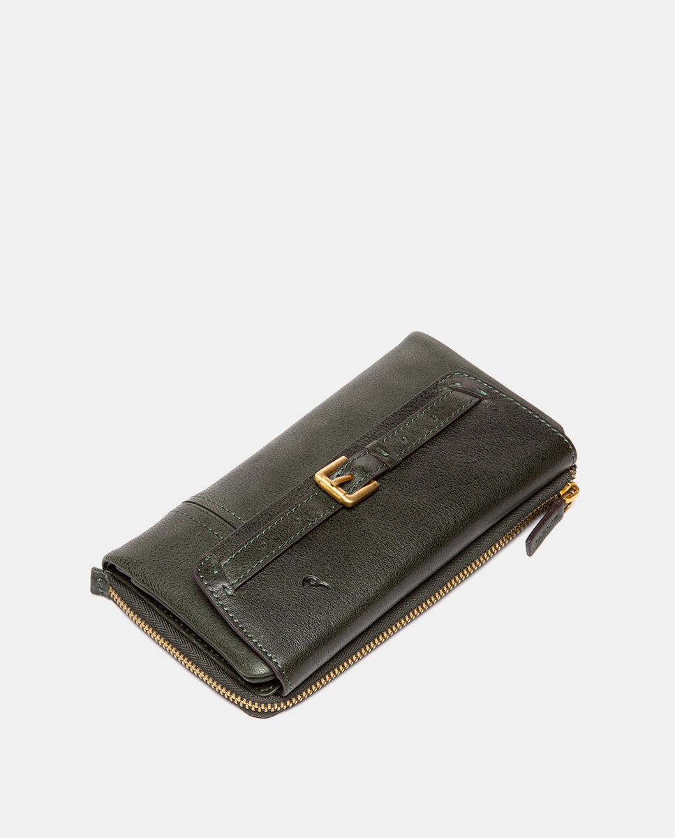 Large women's leather wallet with a design that stands out for its front flap closure, which features a decorative gold buckle. Elegant and functional, it's ideal for those looking for organization and style. Its main features include: