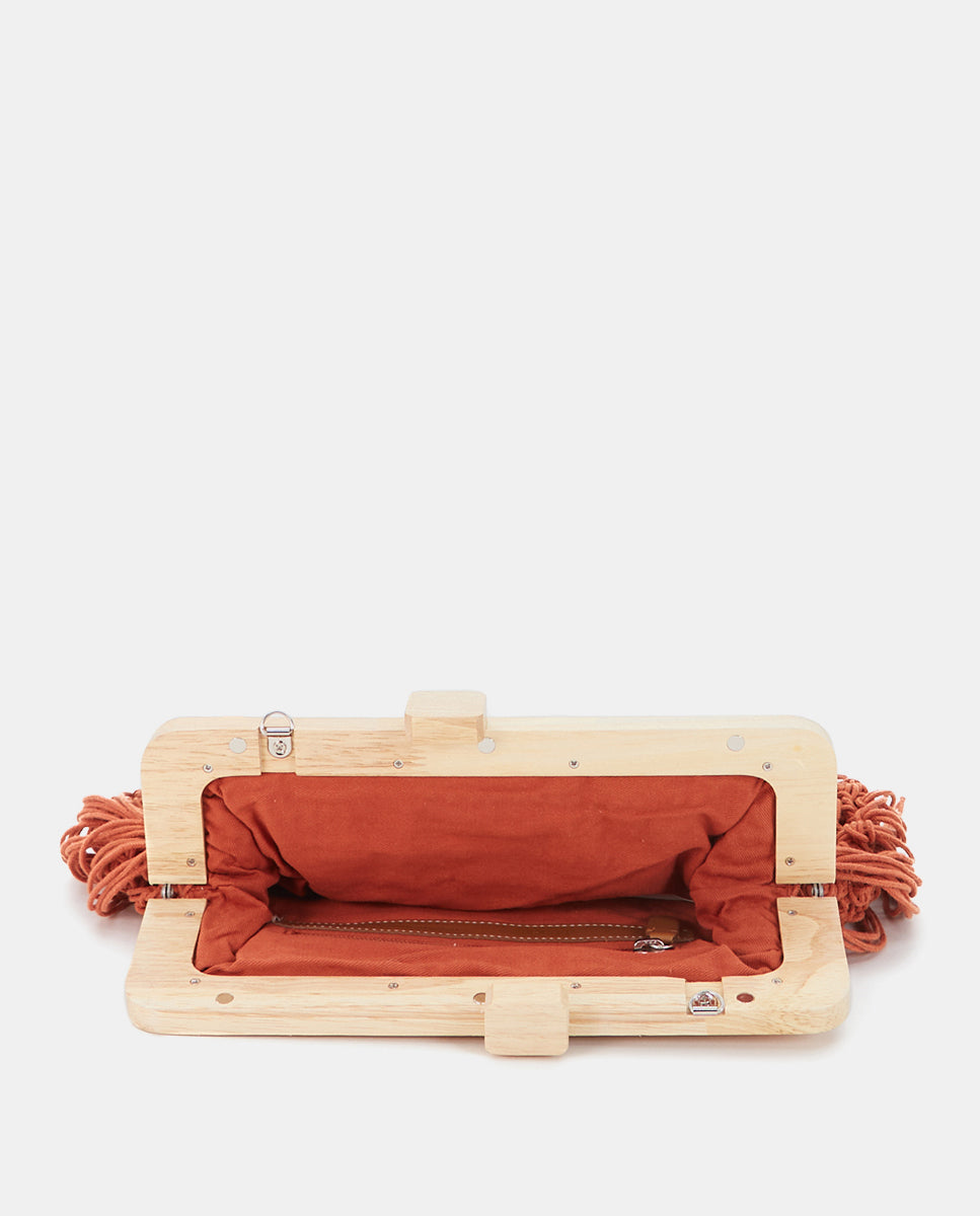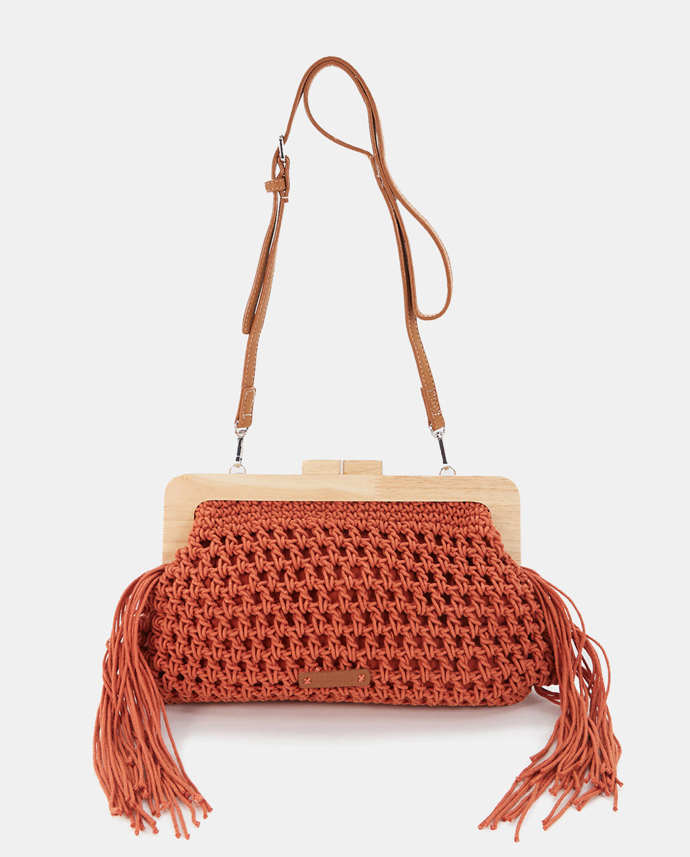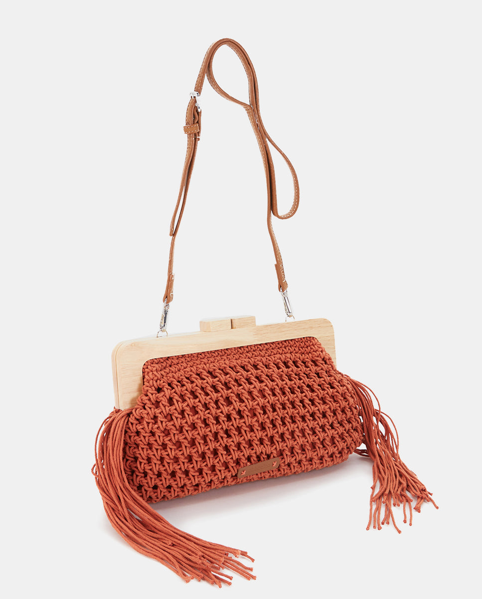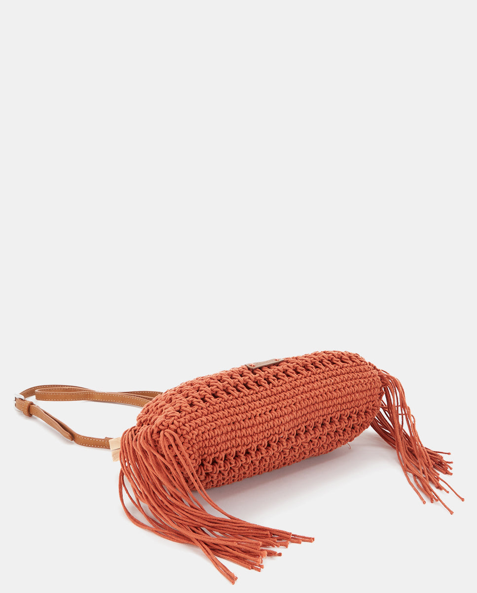Clutch made from macramé with decorative fringes, adding an artisanal and relaxed boho-chic style. Its main features are: