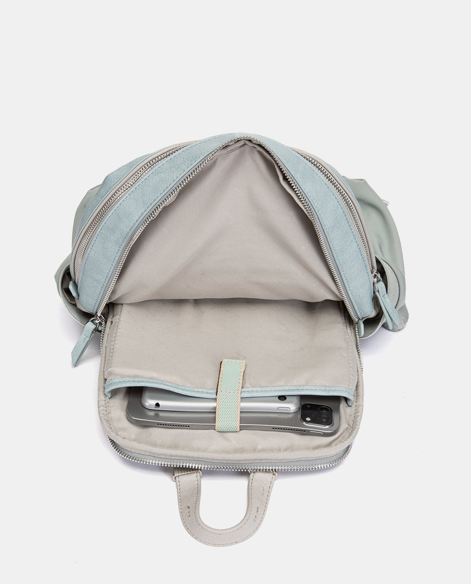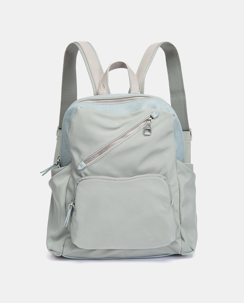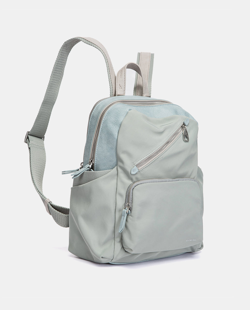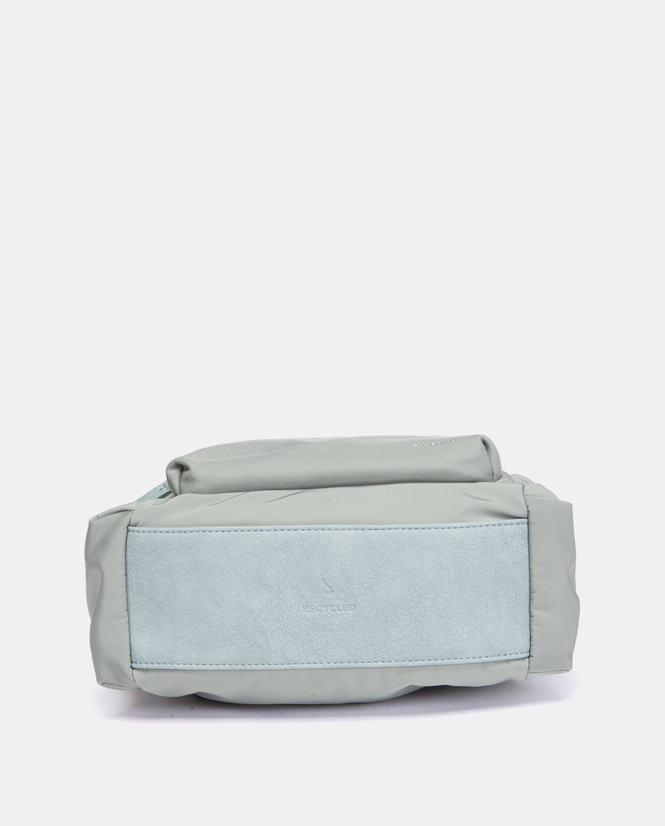 Backpack made from recycled fabrics, combining two different textures and offering great functionality. Its main features are: