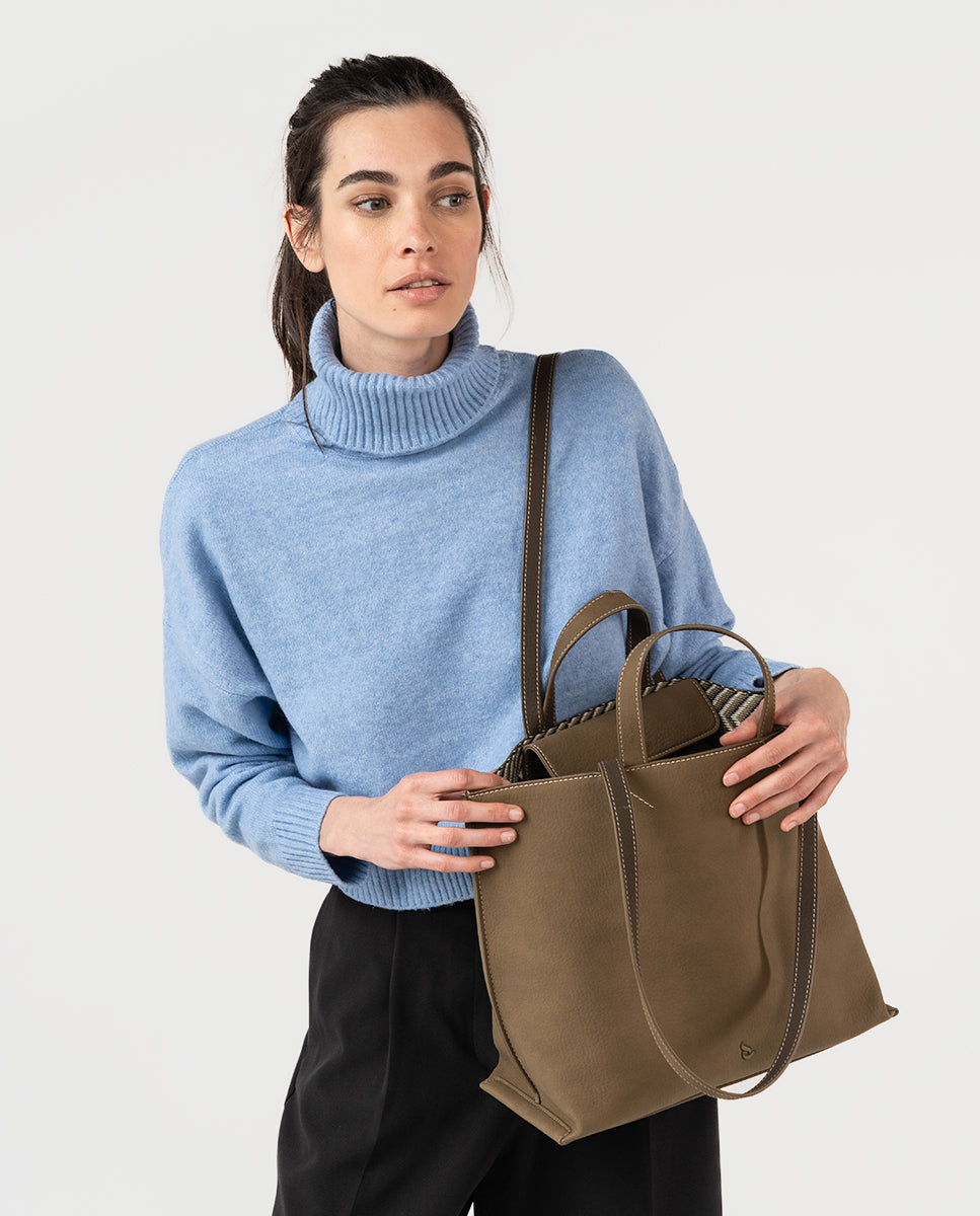 Women's shopper bag made from recycled materials. An informal and urban style design, perfect for accompanying you to the office or for an afternoon of shopping. Its spacious size allows you to carry everything you need for your daily activities, including a laptop. Its main features are: