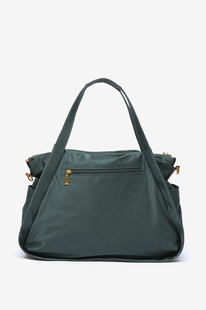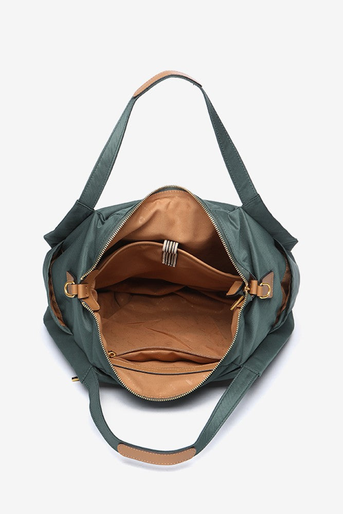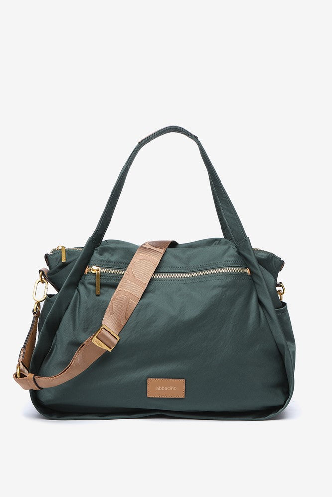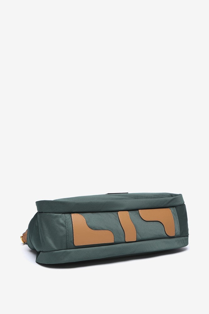• It combines its shoulder handles with a textile crossbody strap that can be adjusted and is detachable.