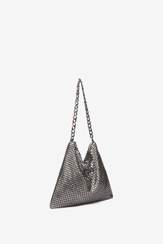 Women's pyramid-shaped party shoulder bag in metallic mesh. A design that dresses in seasonal colours that will make you shine wherever you go, perfect for day and night, it is the ideal choice to create unique looks... Its main features are: