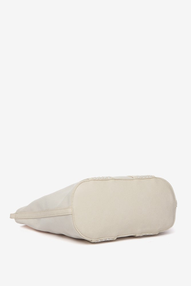 Small women's shopper bag crafted with recycled materials. A basket-style model, spacious and practical, featuring fabric handles with an original geometric embroidery. Dyed in timeless colors, it becomes a staple suitable for any season of the year. Its texture is fluid and very pleasant to the touch. Its main features include: