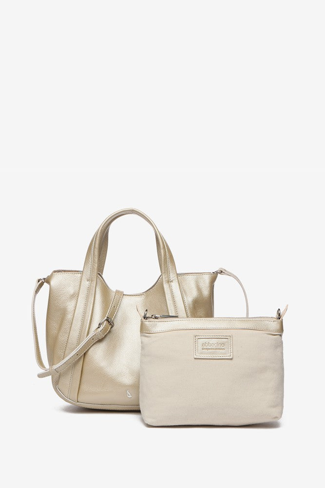 • L'esterno è caratterizzato da cuciture a vista, chiusura magnetica nella parte superiore e una piccola applicazione metallica con il logo del marchio.