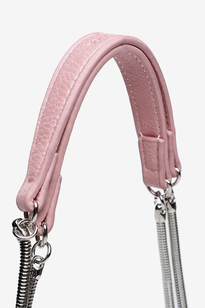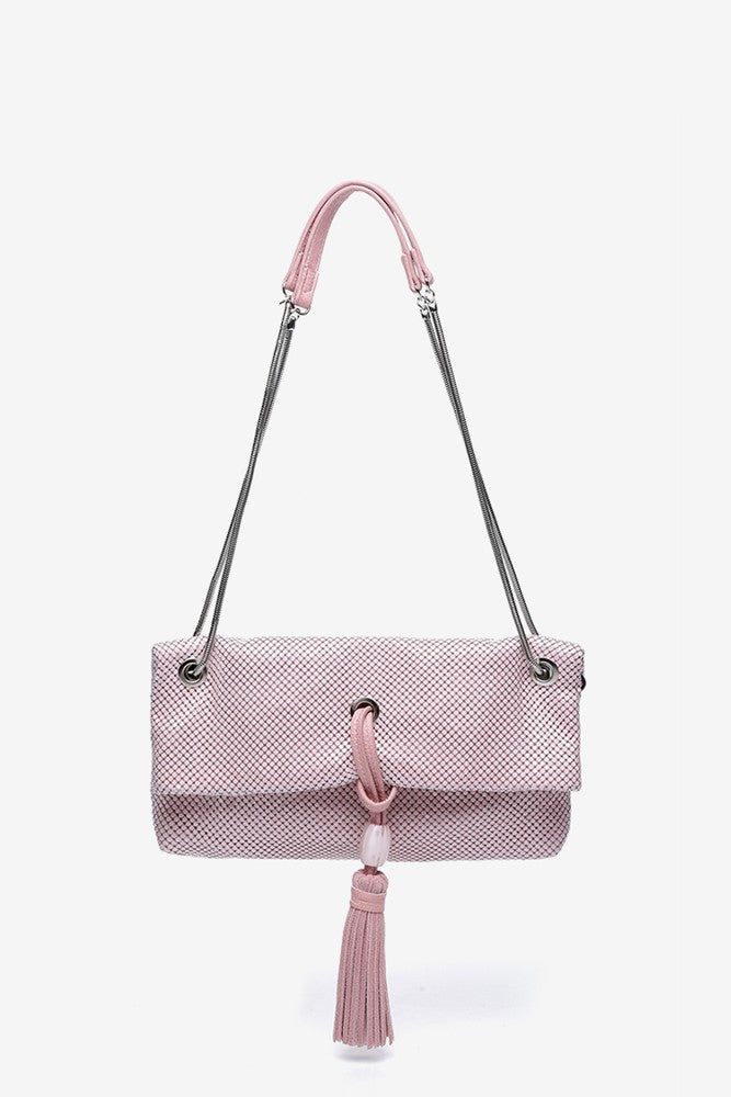 Borsa da festa realizzata in rete metallica con manico multiuso che consente di trasportarla sia con una doppia tracolla che con una tracolla. Flap, base rettangolare comoda e maneggevole, dal look senza tempo. Tasca interna con cerniera. Decorata con nappa in pelle scamosciata e logo inciso sui manici.