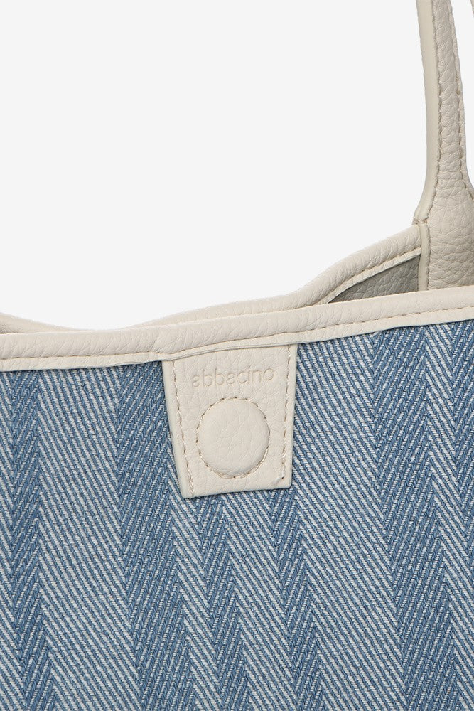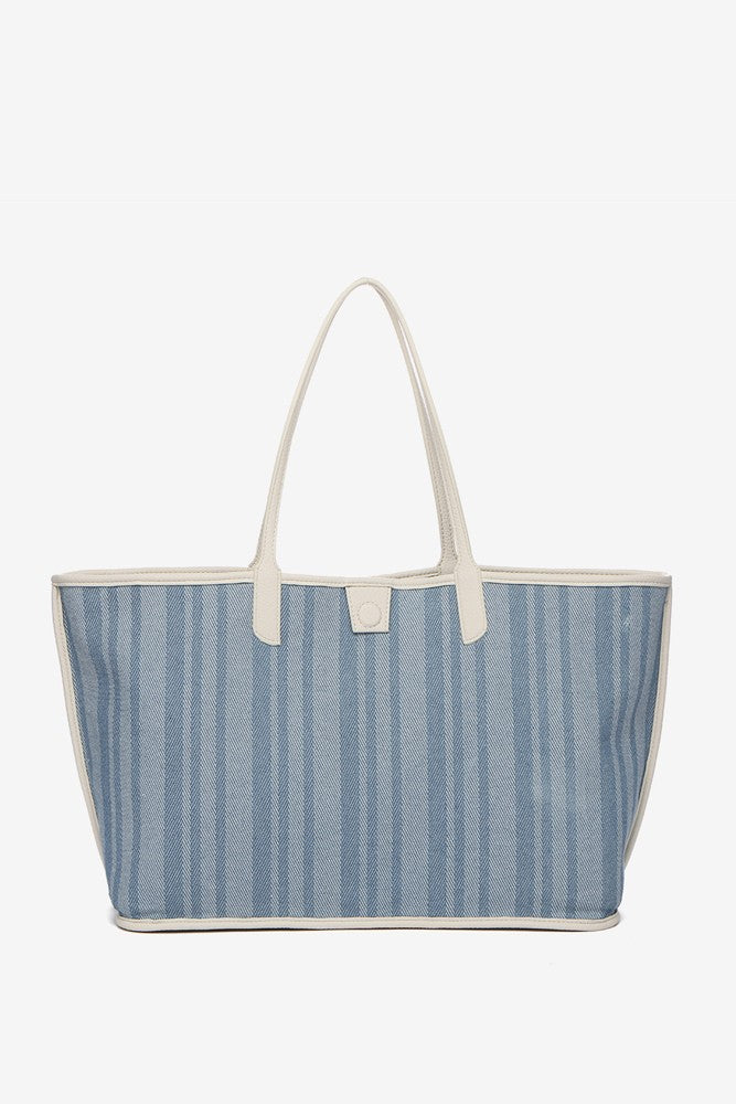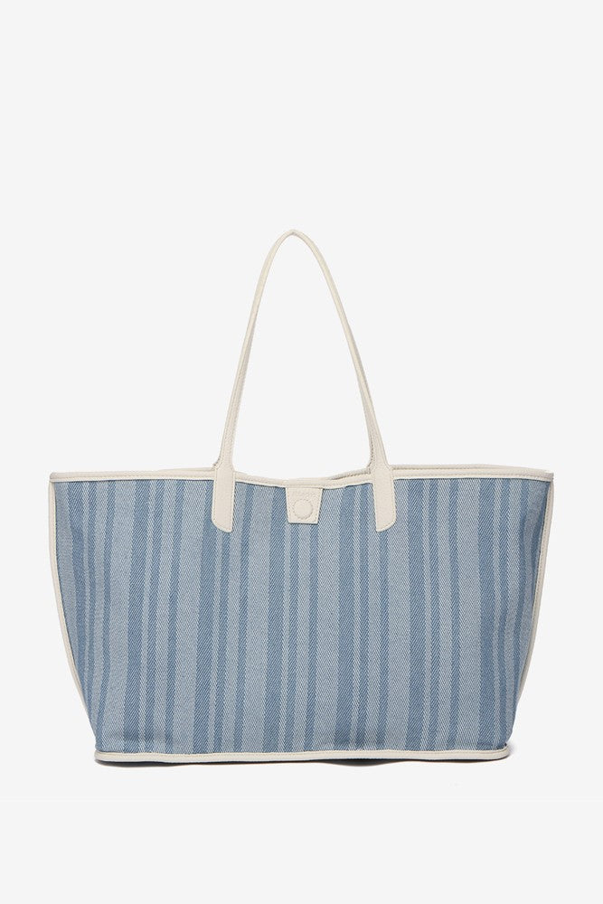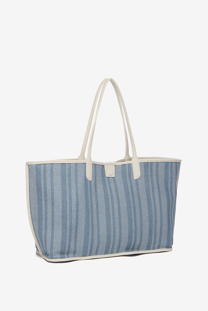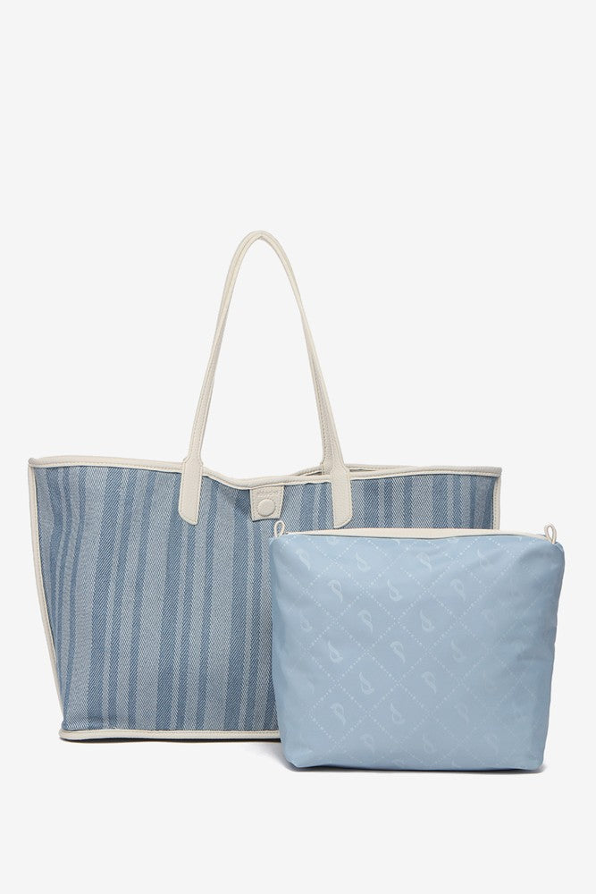 Borsa shopper da donna di grande capienza, realizzata in materiali sintetici. Questa borsa è unica perché è reversibile: un lato è in tinta unita, mentre l'altro presenta una bellissima stampa lineare in stile nautico. Le sue caratteristiche principali sono: