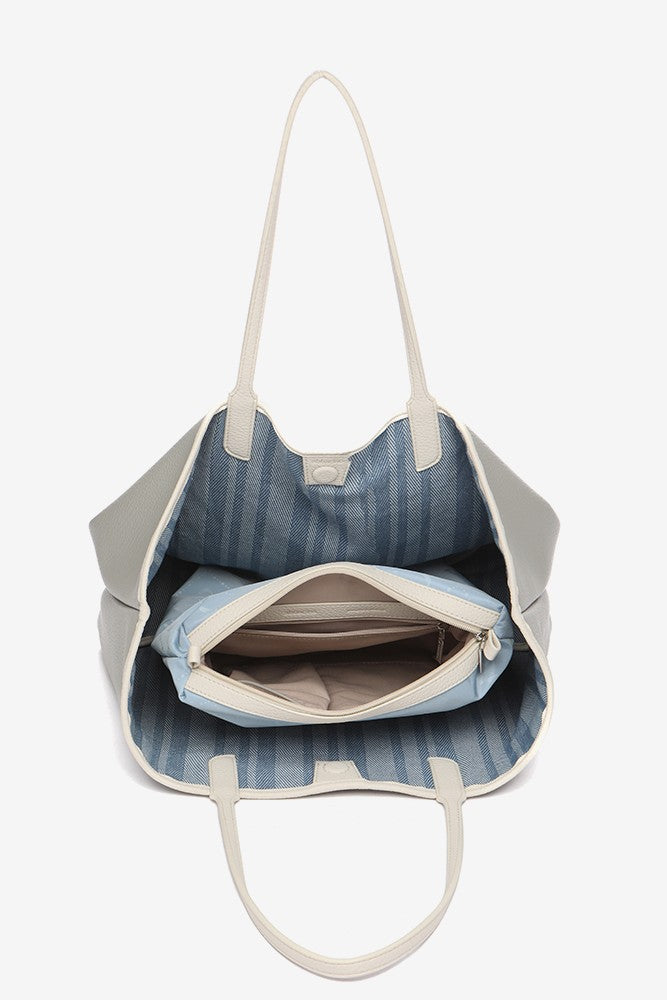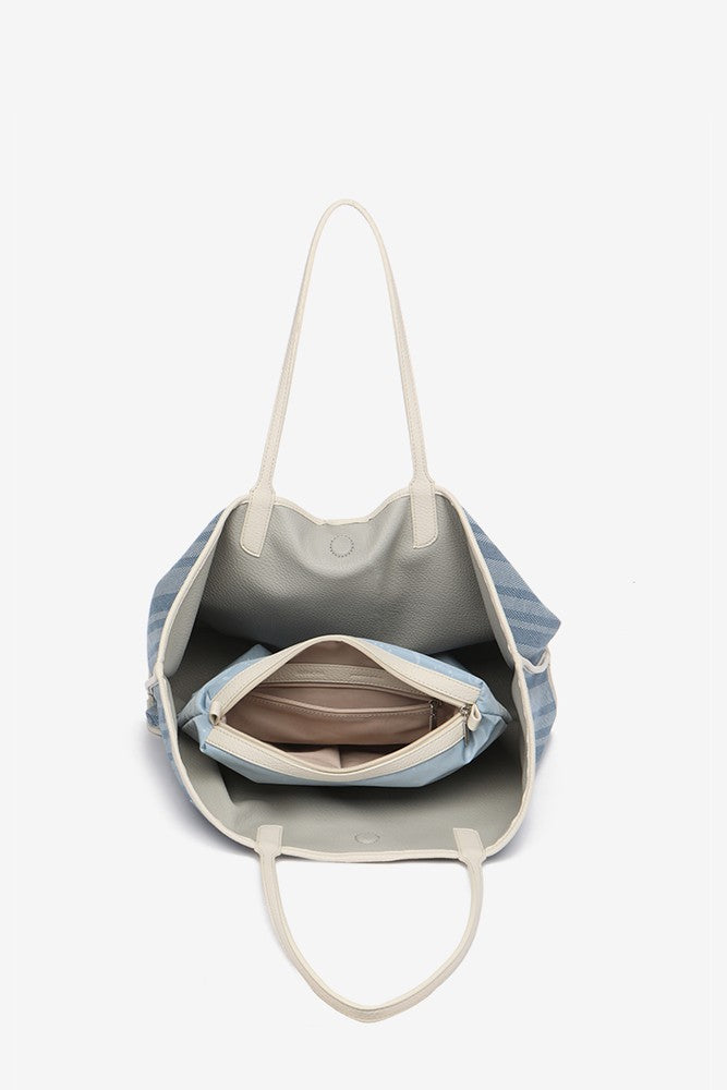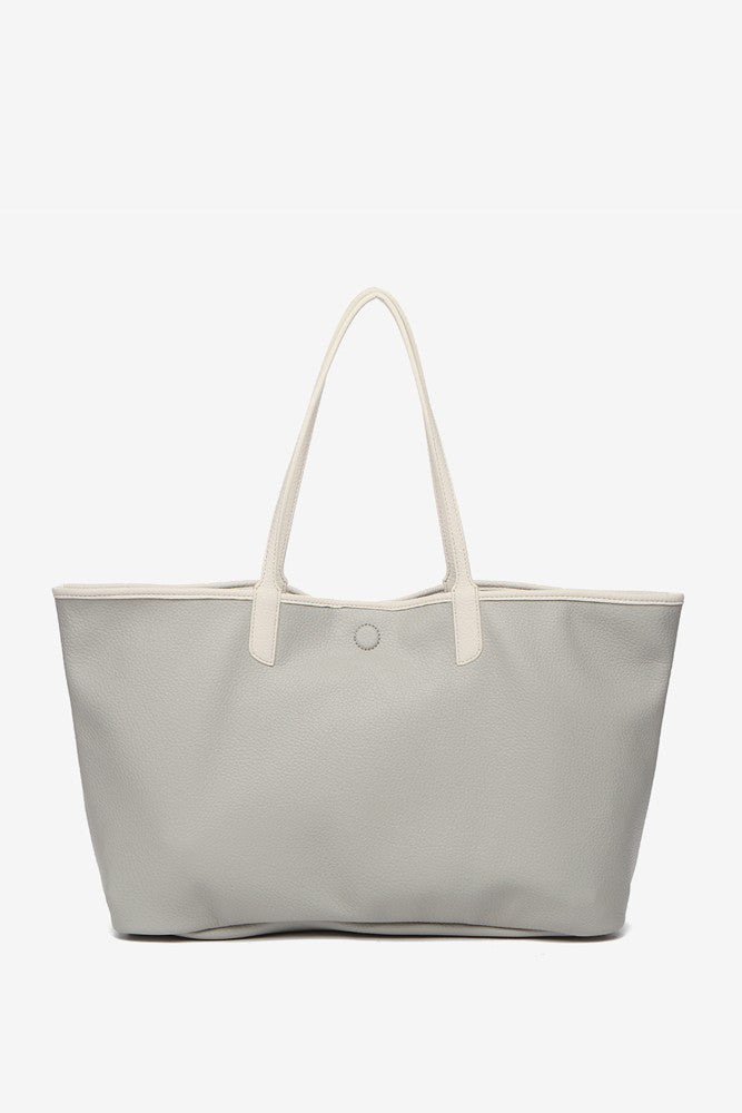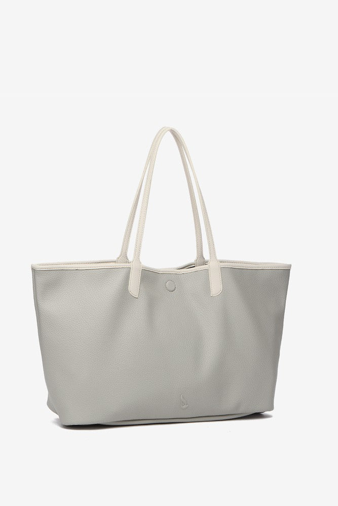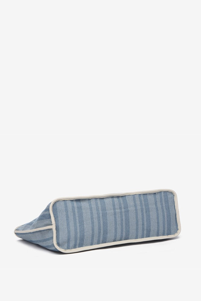 Borsa shopper da donna di grande capienza, realizzata in materiali sintetici. Questa borsa è unica perché è reversibile: un lato è in tinta unita, mentre l'altro presenta una bellissima stampa lineare in stile nautico. Le sue caratteristiche principali sono: