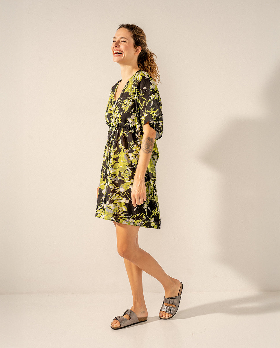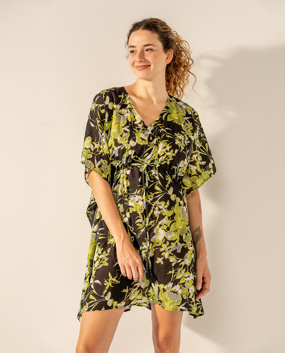 Caftano da donna realizzato in cotone con stampa floreale. Il suo tessuto è molto sciolto e morbido al tatto, rendendolo un accessorio perfetto per accompagnarci durante i giorni più caldi dell'anno. Presenta uno scollo a V lusinghiero e una regolazione con fiocco in vita per stilizzare la silhouette.
