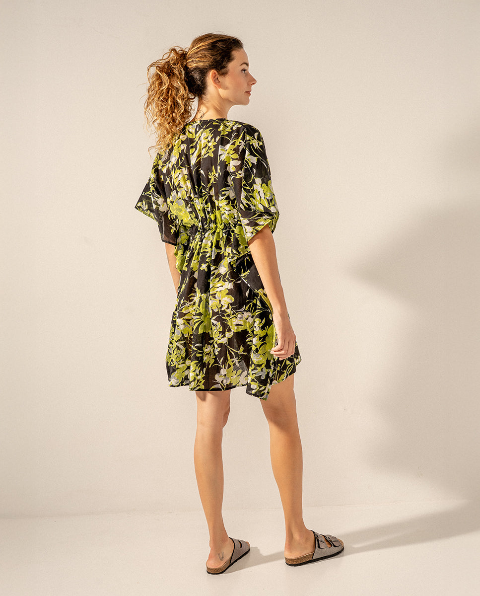Caftano in cotone con stampa floreale nera