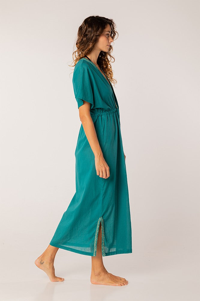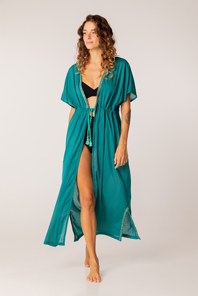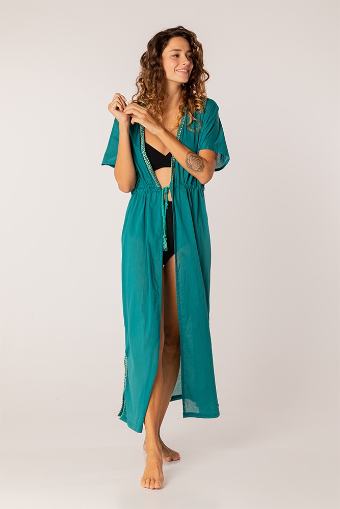 Kimono lungo da donna, ideale per le giornate in spiaggia e anche per una passeggiata al tramonto. Un modello monocromatico caratterizzato da una bellissima applicazione ricamata sullo scollo. Ha un cordino in vita che permette di regolarlo e adattarlo al corpo.