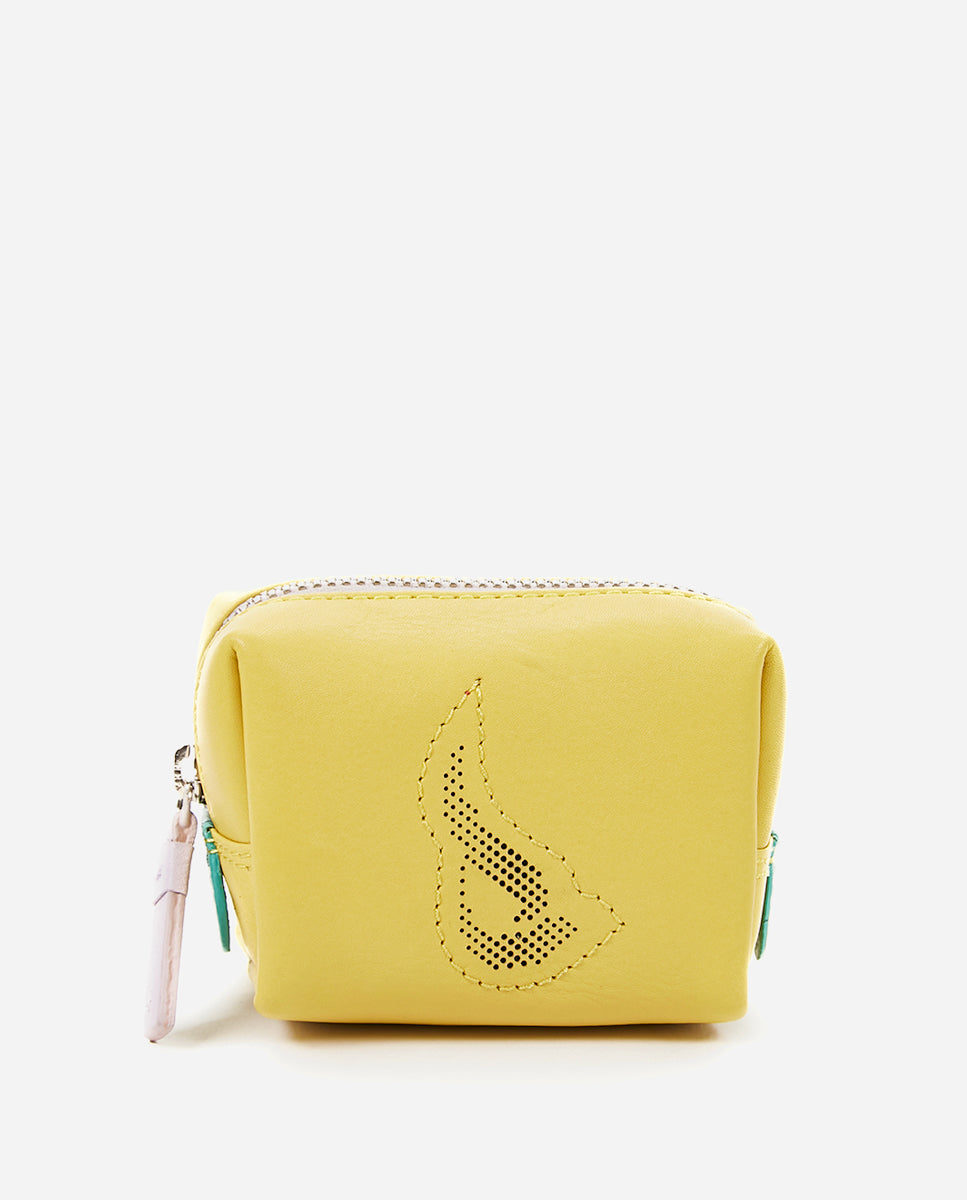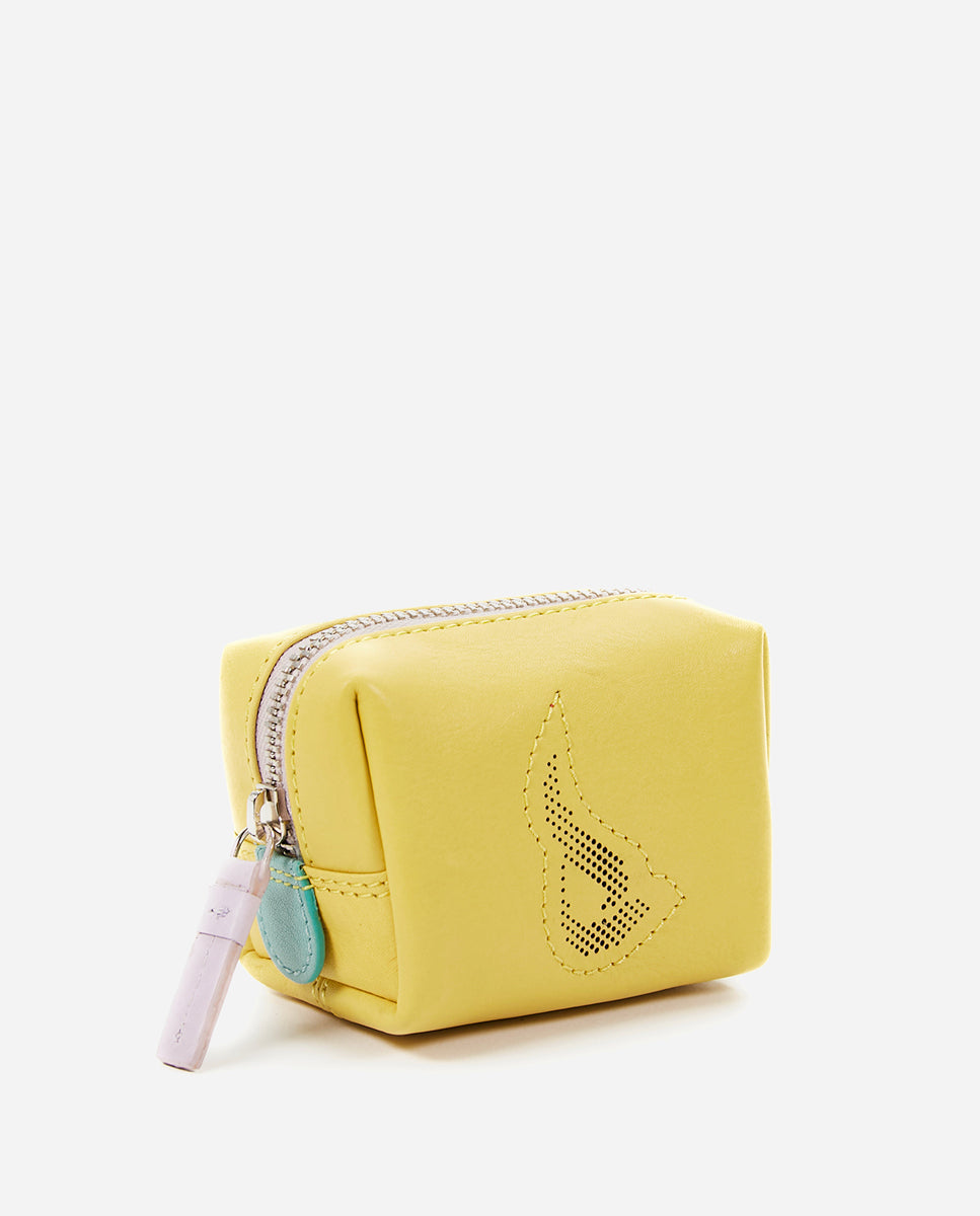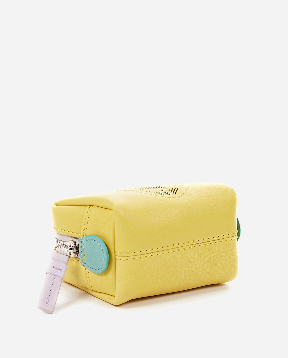 Piccola borsa da toilette da donna in pelle con logo fustellato giallo