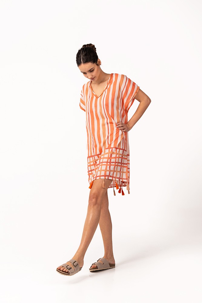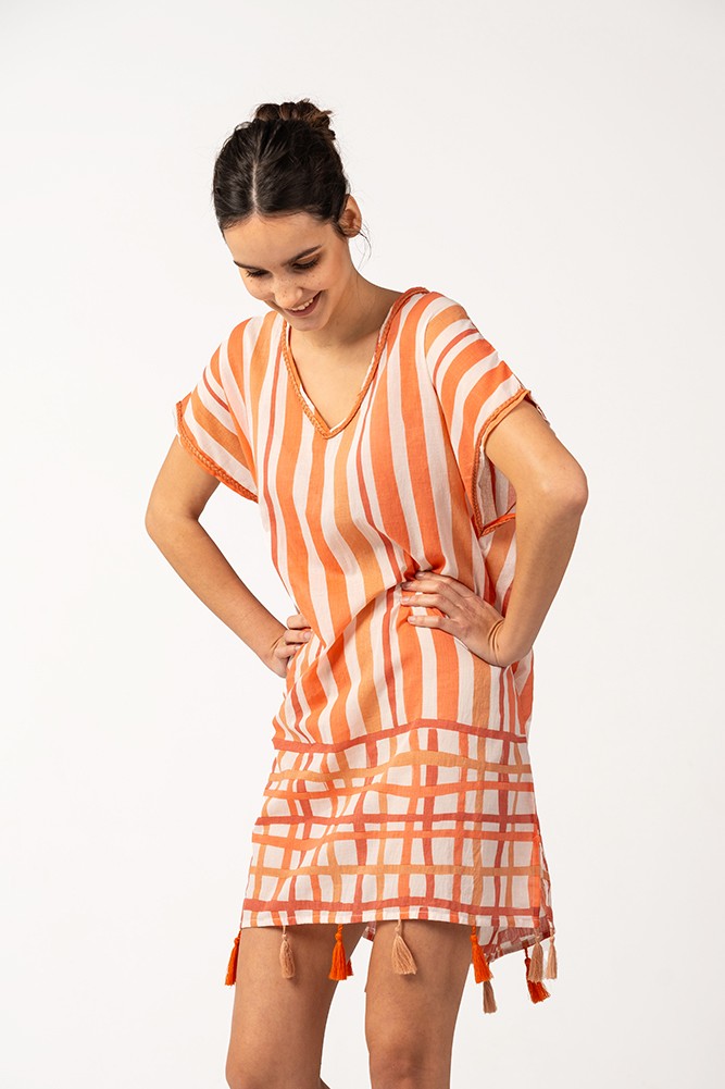 Caftano da donna in cotone con stampa a righe. I suoi colori vivaci e la sua stampa ci trasportano direttamente alle calde giornate estive. Il suo tessuto è molto morbido e vaporoso al tatto, rendendolo un accessorio perfetto per accompagnarci durante le giornate più calde dell'anno. Presenta una scollatura a V molto carina e nappe sul fondo.