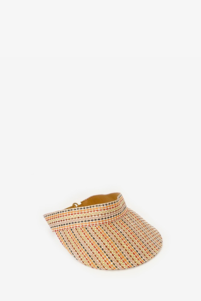 Cappello da donna con visiera, intrecciato a mano. Un design semplice a righe, con regolazione elastica posteriore che consente di adattarlo alla testa. Ideale per le giornate in spiaggia.