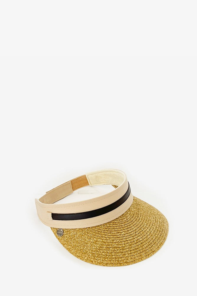 Cappello da donna con visiera, intrecciato a mano. Un design semplice caratterizzato da una grande fascia nera e da una regolazione posteriore che consente di adattarlo alla nostra testa. Ideale per le giornate in spiaggia.