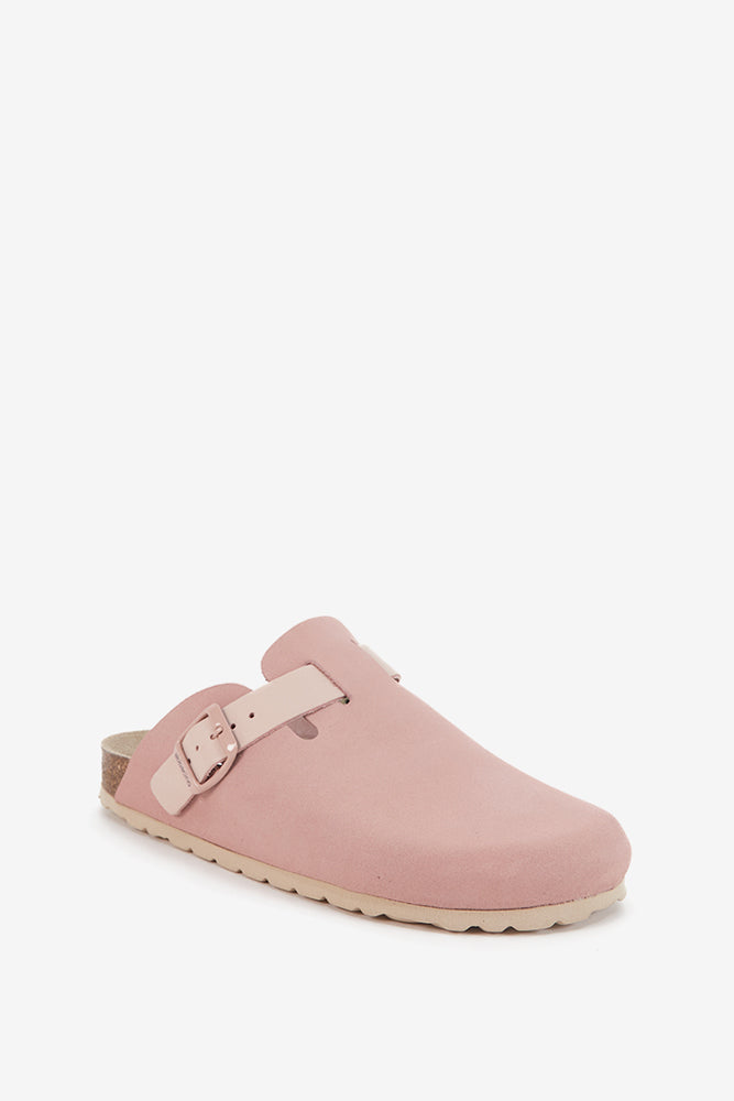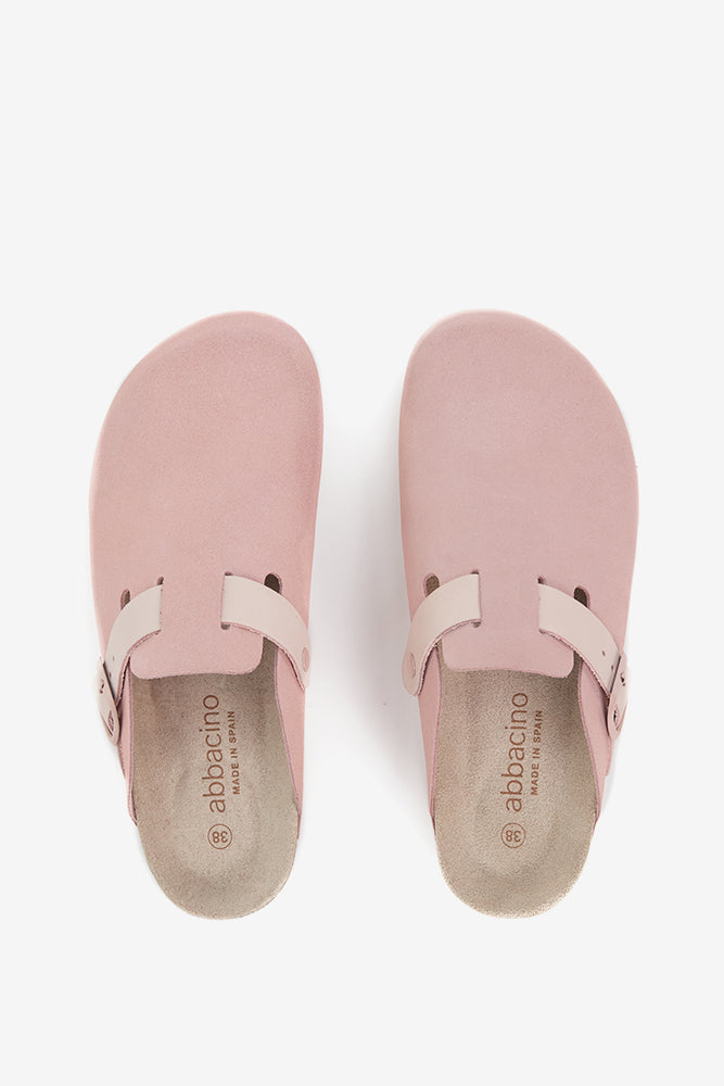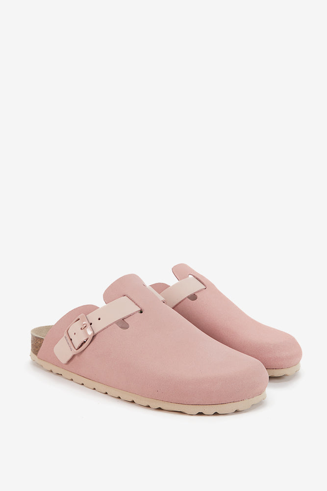 Zoccolo da donna in pelle scamosciata con fibbia. Un design classico e senza tempo realizzato con materiali di alta qualità. La sua estetica minimalista e versatile lo rende la scelta ideale per l'uso quotidiano, offrendo stile e benessere a ogni passo. La soletta si adatta alla conformazione naturale del piede, garantendo un supporto plantare eccellente e un'ammortizzazione ottimale. (suola in EVA).