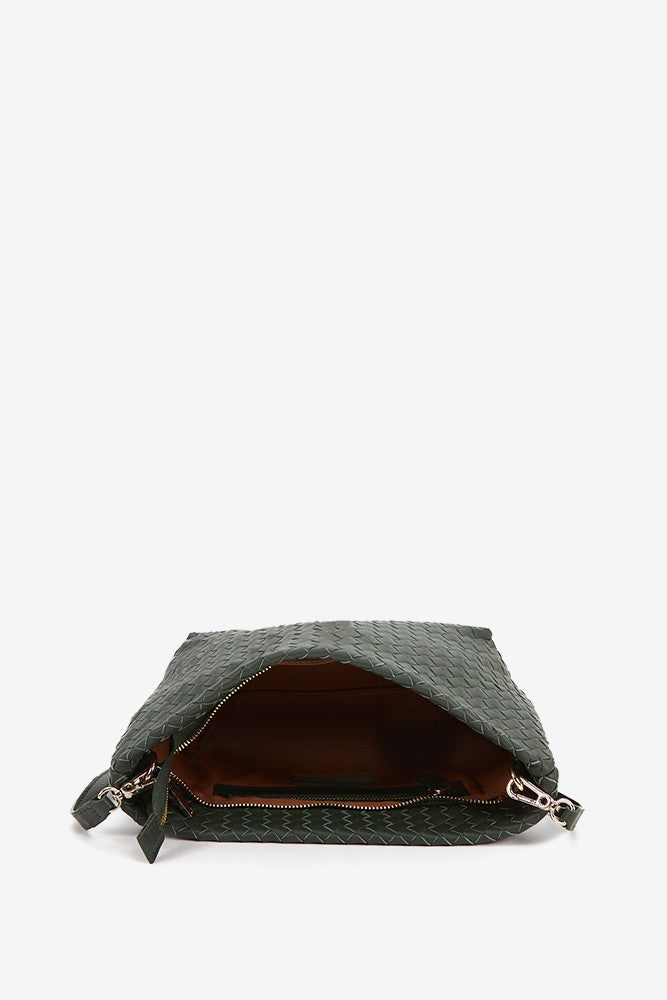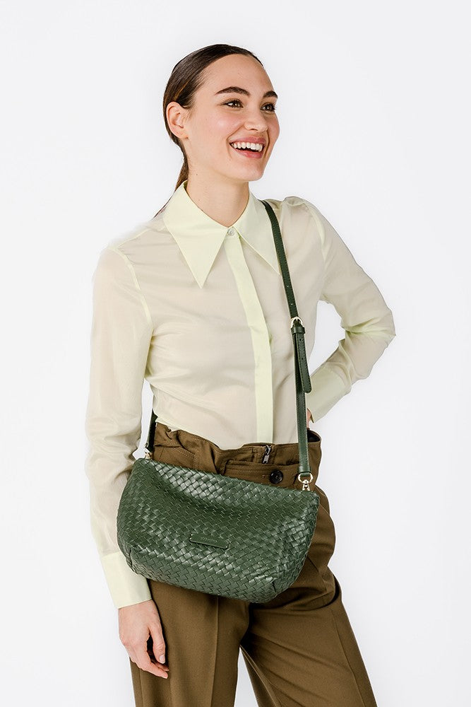 Bandolera grande de mujer en piel Premium trenzada artesanalmente y elaborado en Italia. Un diseño de tamaño medio, perfecto para el día a día, teñido en colores otoñales muy fáciles de combinar y de inspiración mediterránea.